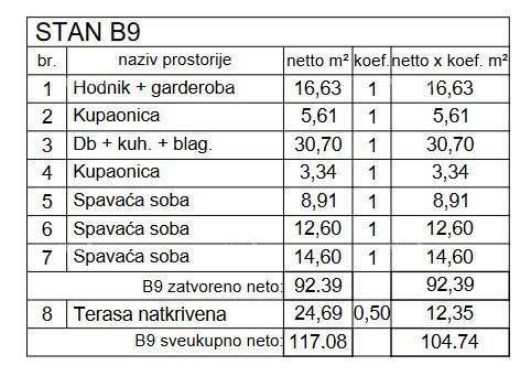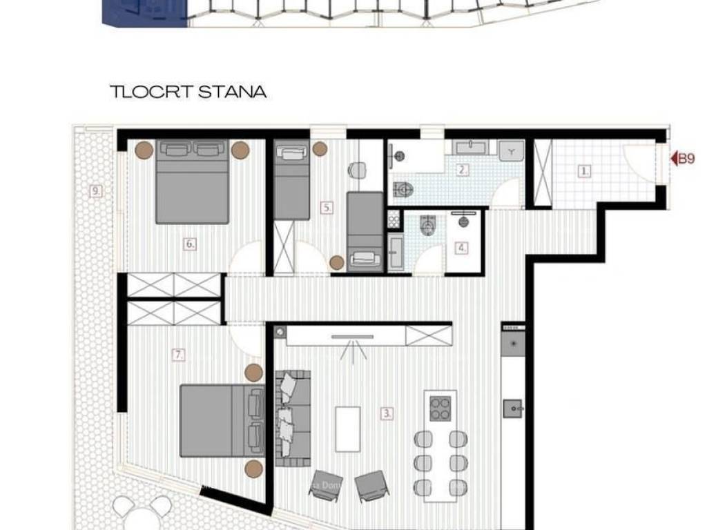 Luxury apartments with a view of Marina Veruda!Apartment B9 has a ​​117.08 m2 (net usable area of 104.74 m2, located in building B.The apartment is located on the 1st floor of the building and consists of a hallway + wardrobe, living room with kitchen and dining room, 3 bedrooms, 2 bathrooms, and a covered terrace.The apartments are sold according to the "turnkey" system with a fully equipped bathroom (furniture and sanitary ware), floor coverings in all rooms (class 1 ceramics, laminate), installed electrical installations, built-in air conditioning, internal carpentry, external PVC or ALU carpentry, burglar-proof, and fire-proof entrance doors, antenna system, UTP network, and white walls and ceilings.The apartment has a storage room and a garage space, which are charged additionally.For further information, please contact:Azra+385 91 6115706+385 98 420885azra@almadominvest.com