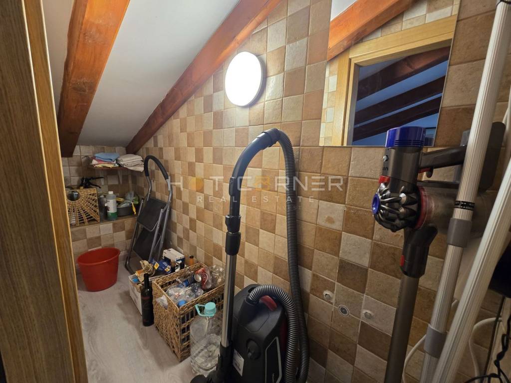 The layout is thoughtfully arranged: the entrance hall opens to two spacious bedrooms, each with its own en suite bathroom, while a practical storage room adds functionality. The upper level reveals an impressive open-plan space combining a kitchen, dining area, and living room. From here, you can enjoy a spectacular panoramic view over Rovinj’s picturesque rooftops towards the beach, the Adriatic Sea, and St. Catherine Island – a view that will leave you breathless.