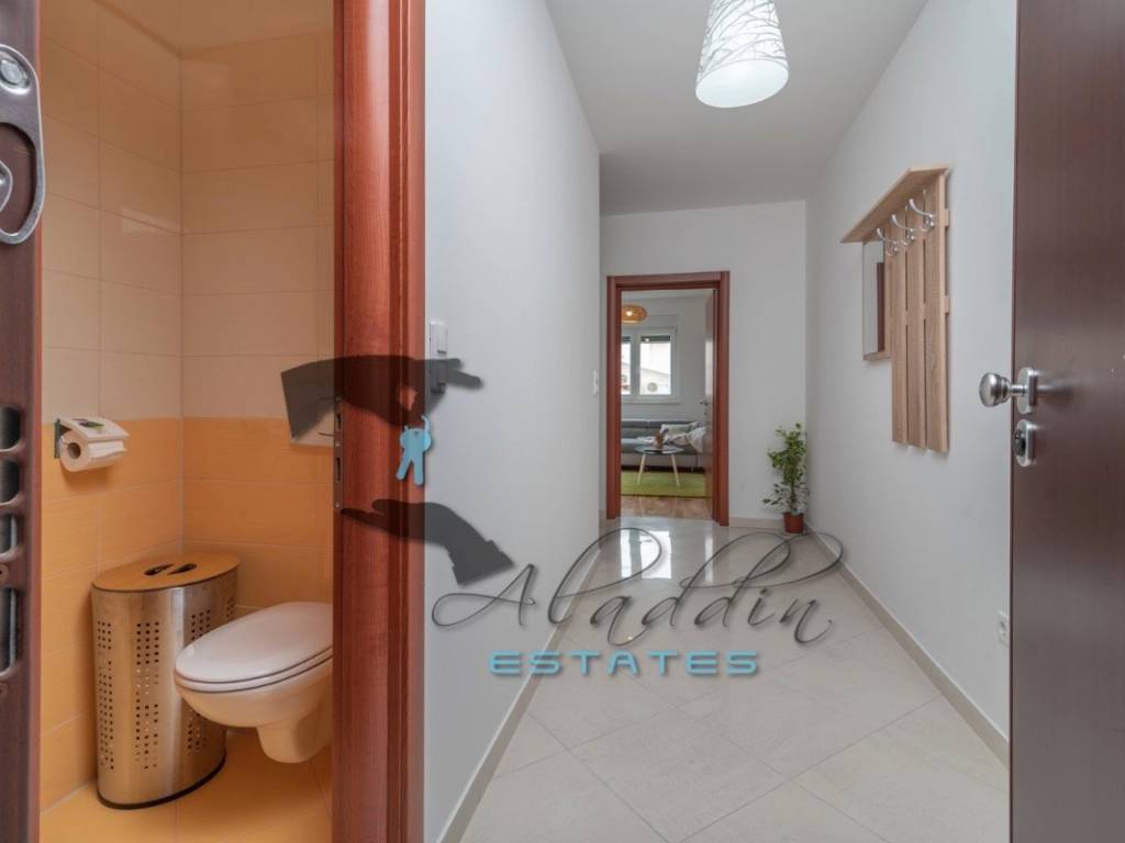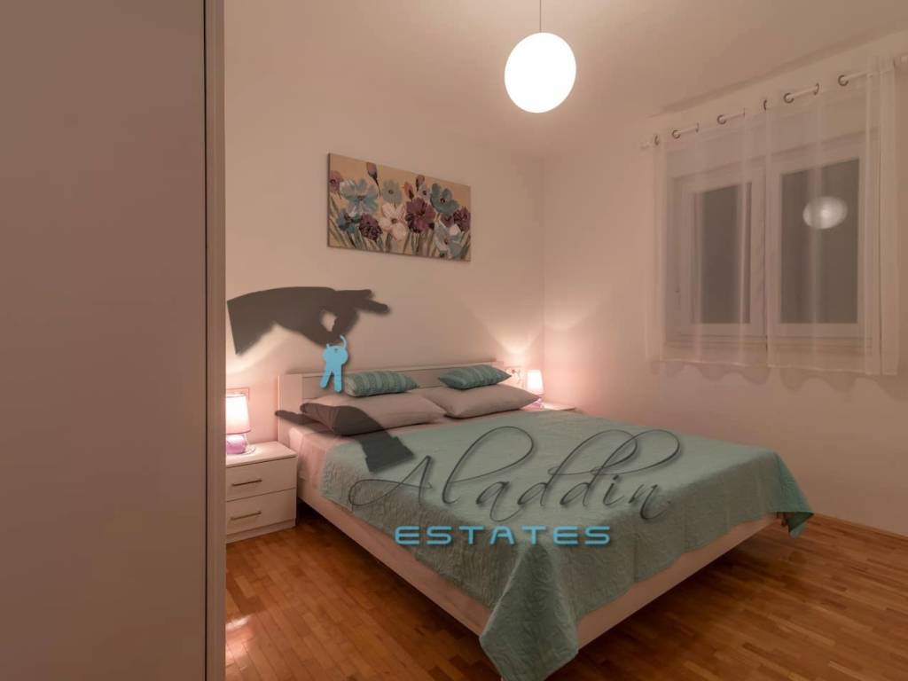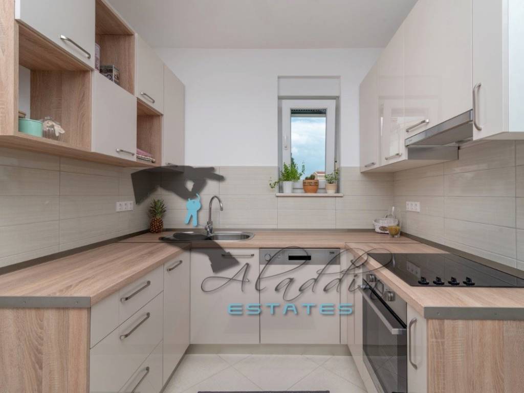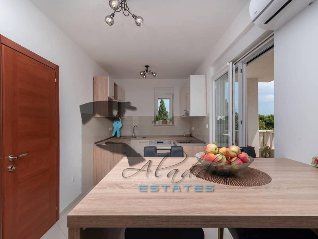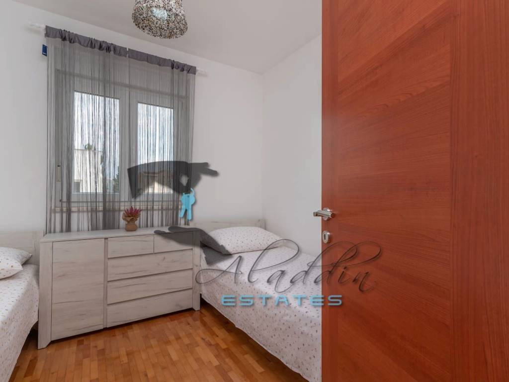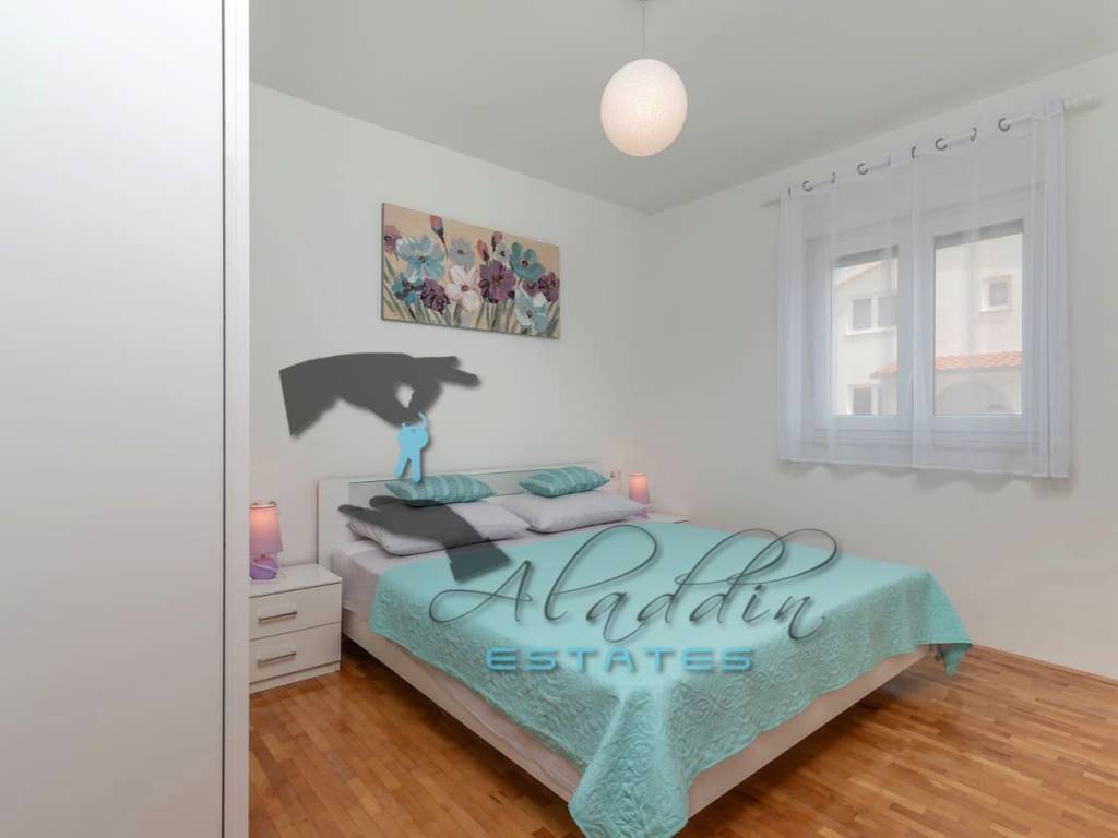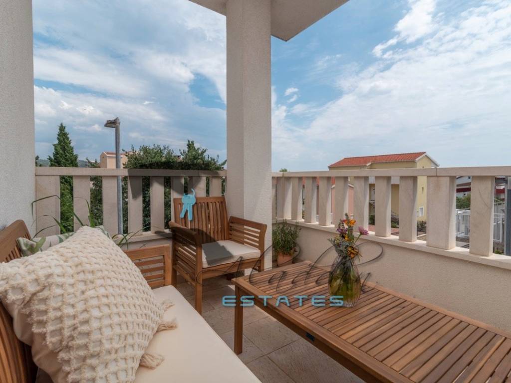 Extremely attractive apartment on the first floor of a four-story residential building in Okrug Gornji. It is located on the southern side of the island, recently built and exceptionally well-maintained, practically like new, and is also adorned with a beautiful sea view. It consists of a large living room combined with a dining area and kitchen, two bedrooms, a bathroom, storage room, WC, hallway, basement storage, and a luxurious balcony. It contains 69.49 m² of internal living space, or 80.29 m² including the balcony. It is fully furnished and equipped, including a powerful air conditioner, TV, wireless internet, hydromassage bathtub, balcony furniture, and burglar/fireproof doors. First-class natural parquet flooring is installed in the bedrooms and living room. The apartment, as well as the entire building, is excellently constructed and of high quality, everything is in excellent condition without the slightest defects. The surroundings are very quiet, the neighborhood is excellent, and at the same time, everything is very close, starting from the sea and the beach to all additional amenities, and finally, Trogir and the airport are within reach. The apartment also includes one parking space.