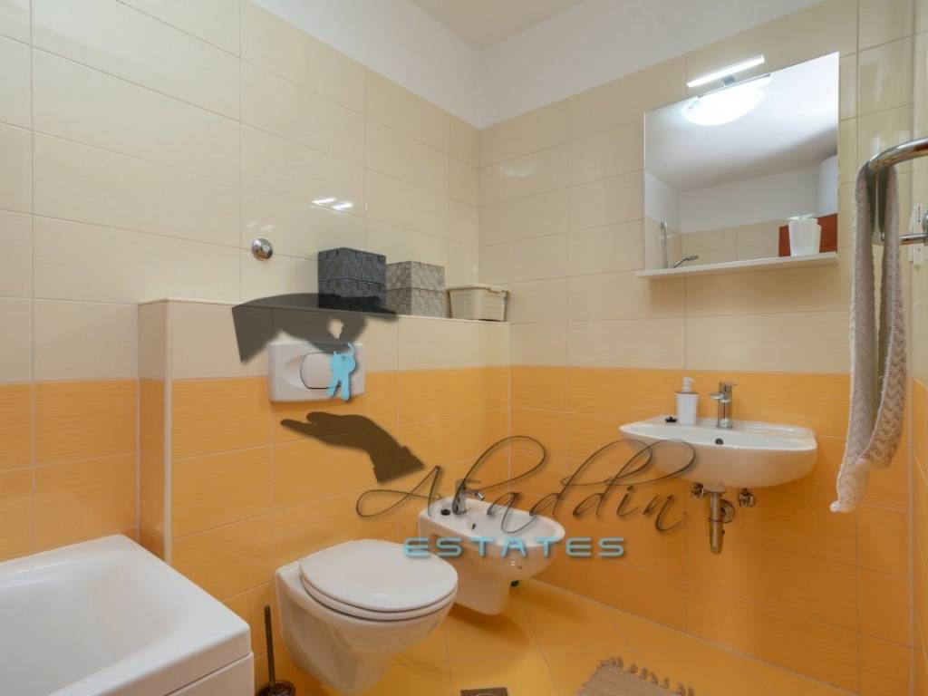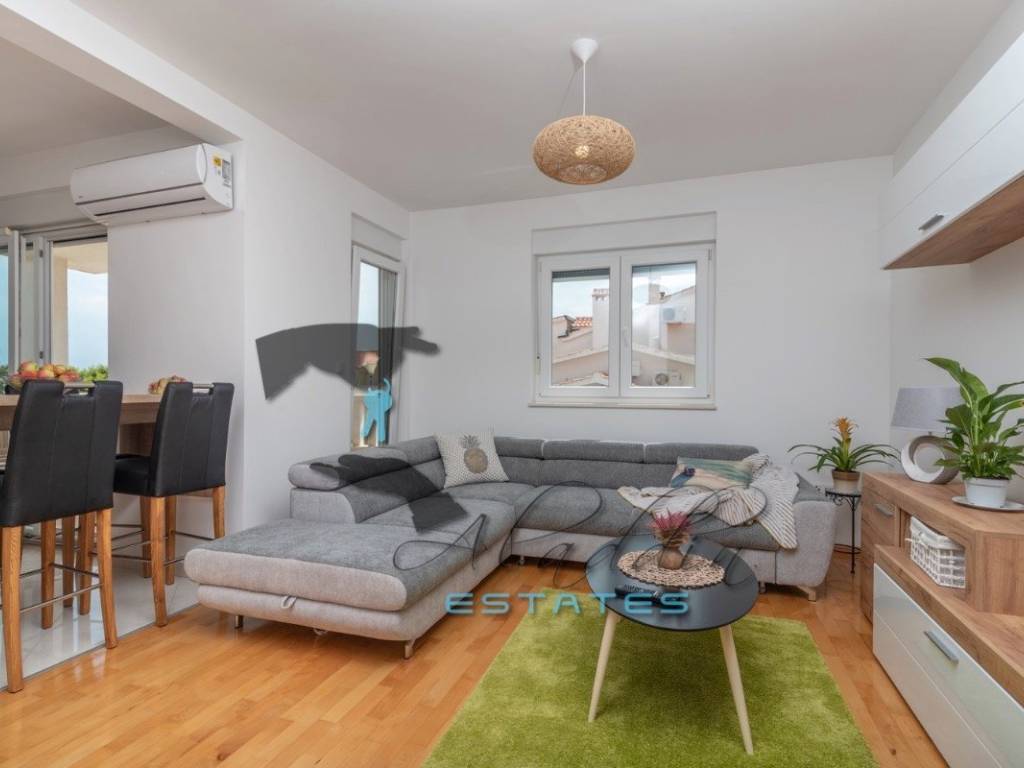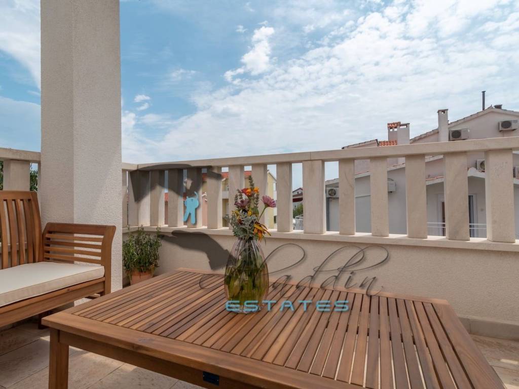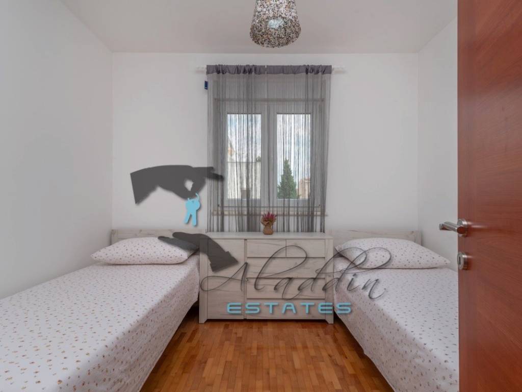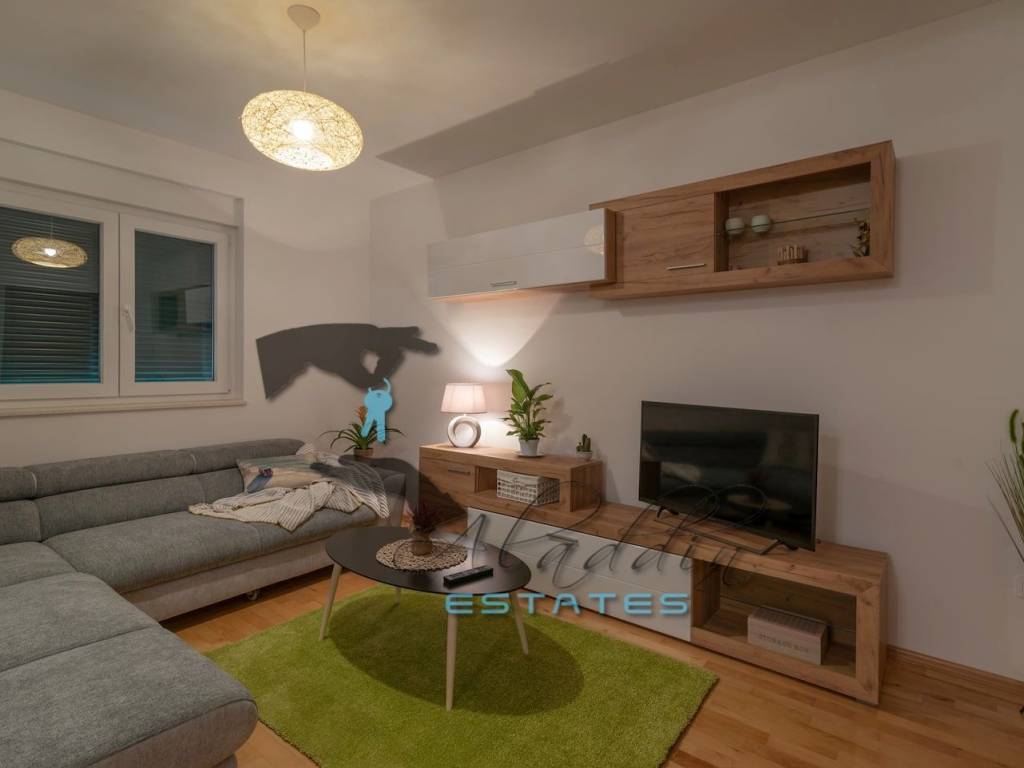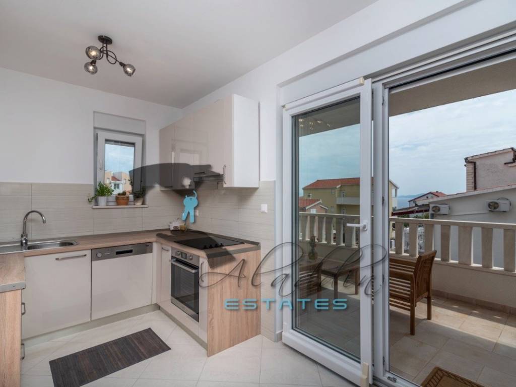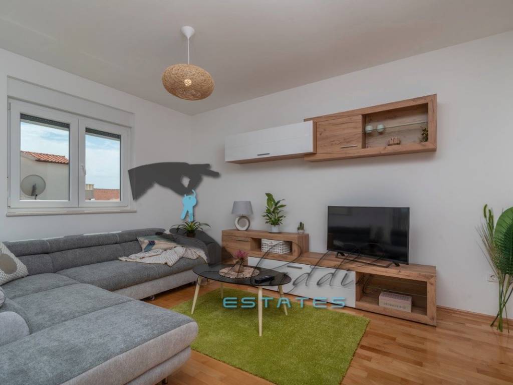 Extremely attractive apartment on the first floor of a four-story residential building in Okrug Gornji. It is located on the southern side of the island, recently built and exceptionally well-maintained, practically like new, and is also adorned with a beautiful sea view. It consists of a large living room combined with a dining area and kitchen, two bedrooms, a bathroom, storage room, WC, hallway, basement storage, and a luxurious balcony. It contains 69.49 m² of internal living space, or 80.29 m² including the balcony. It is fully furnished and equipped, including a powerful air conditioner, TV, wireless internet, hydromassage bathtub, balcony furniture, and burglar/fireproof doors. First-class natural parquet flooring is installed in the bedrooms and living room. The apartment, as well as the entire building, is excellently constructed and of high quality, everything is in excellent condition without the slightest defects. The surroundings are very quiet, the neighborhood is excellent, and at the same time, everything is very close, starting from the sea and the beach to all additional amenities, and finally, Trogir and the airport are within reach. The apartment also includes one parking space.