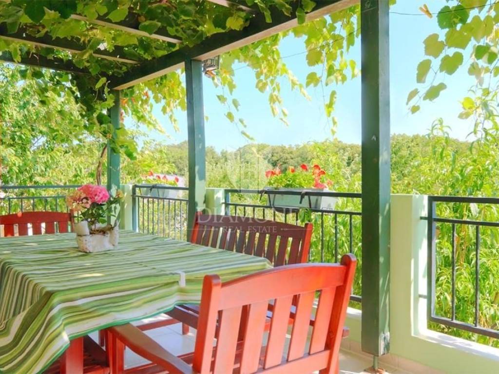 The house consists of two separate apartments with the possibility of internal connection. The ground-floor apartment (approx. 100 m²) features a hallway, two spacious bedrooms, a bathroom, a storage room, a kitchen, and a living room with access to a lovely terrace overlooking the garden. The upper apartment, located in the attic and measuring about 50 m², includes two bedrooms, a kitchen, a living room, a bathroom, and a storage area — ideal for guests or as an additional living unit. The property sits on a large 1,000 m² plot with a swimming pool, lush greenery, numerous fruit trees, a summer kitchen for outdoor gatherings, and ample parking.