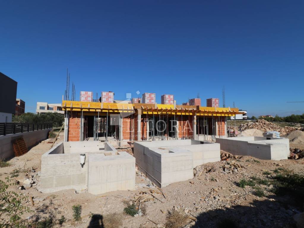 Vodice – Modern semi-detached family house in a quiet location with pool. The house is spread over two floors (ground floor + first floor) with a total usable area of 92.21 m². It features a large terrace/sundeck, an outdoor pool, and a spacious parking area for up to three vehicles. The ground floor includes an outdoor storage room, entrance hall, guest toilet, and an open-plan living room with kitchen and dining area, with access to the terrace. The first floor consists of three bedrooms and two bathrooms. The house is equipped to a high standard: security door, aluminium joinery with mosquito nets and shutters, high-quality ceramic tiles, underfloor heating in the living room and bathrooms.