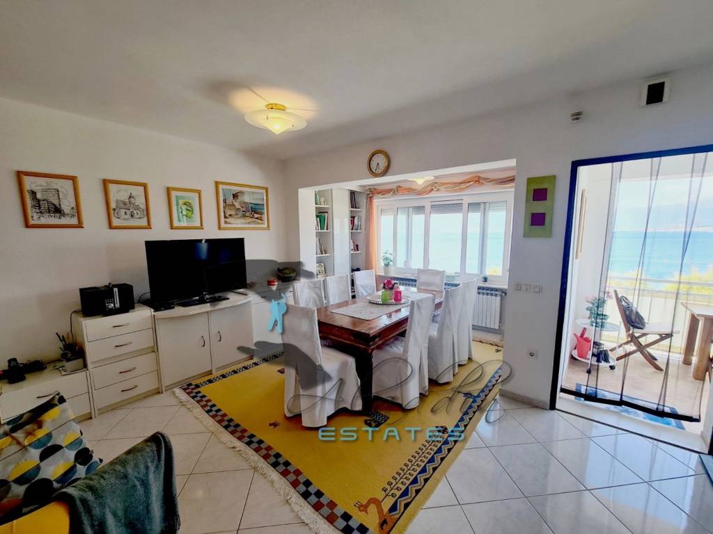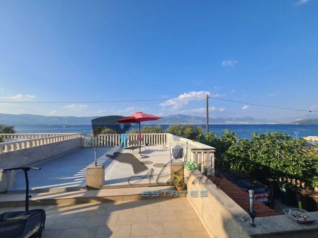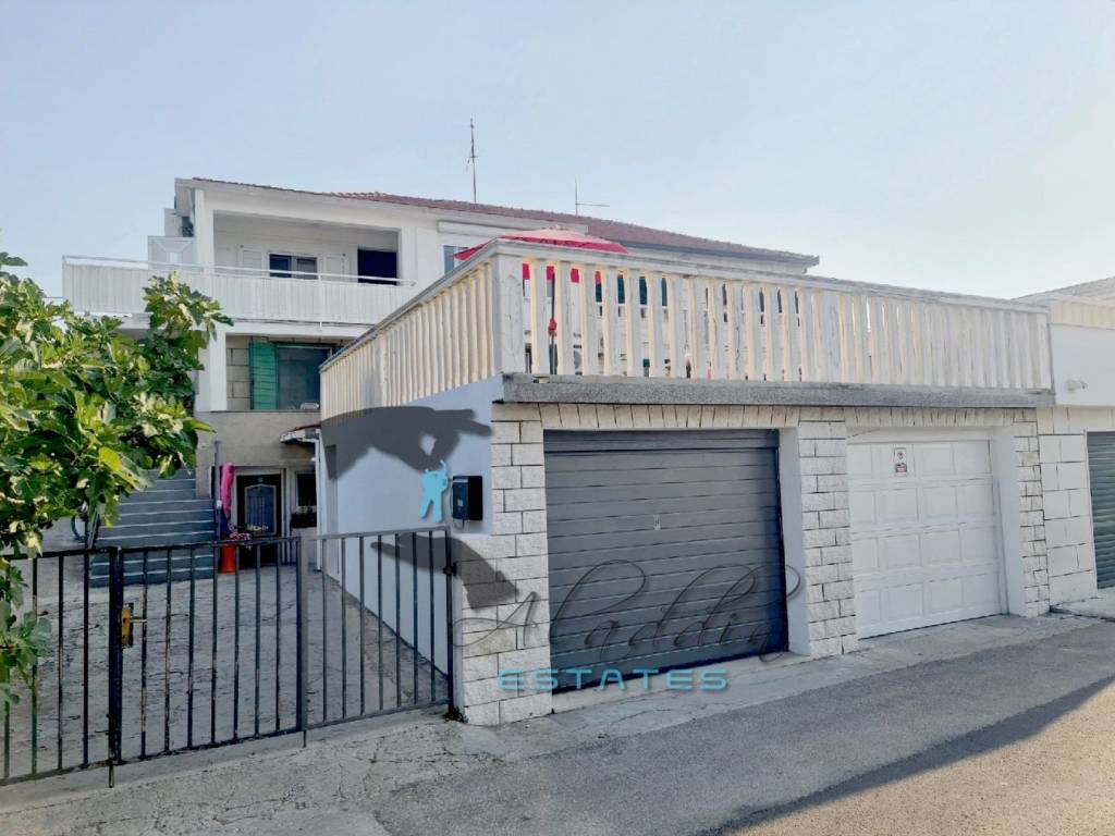 Residential house in the first row to the sea in Slatine, a true summer residence for relaxation and enjoyment. It rises on three floors with 421 square meters of gross living space, solid and quality construction, very well equipped and fully furnished. On the ground floor, there is a workshop and several spacious storage rooms, fully functional (including a refrigerator and freezer) and offering various usage options, including conversion into living space. For this purpose, a smaller apartment has already been arranged. On the front side, there are two separate garages, each for one vehicle, with remote-controlled doors, and on the side, two more parking spaces are installed.