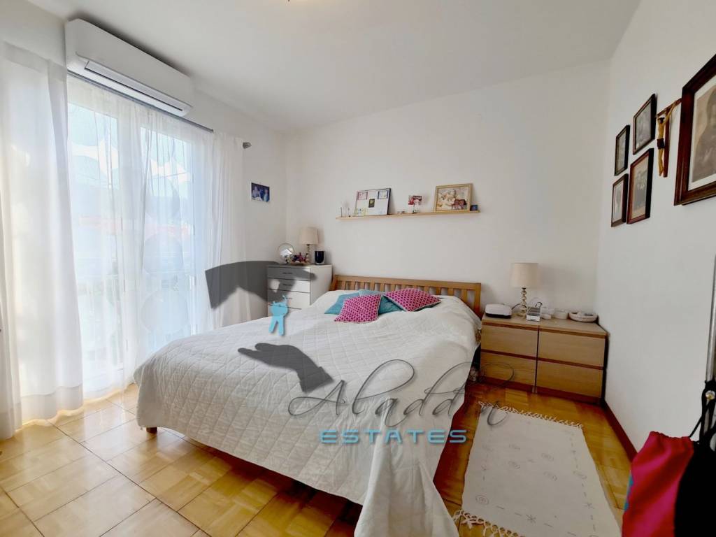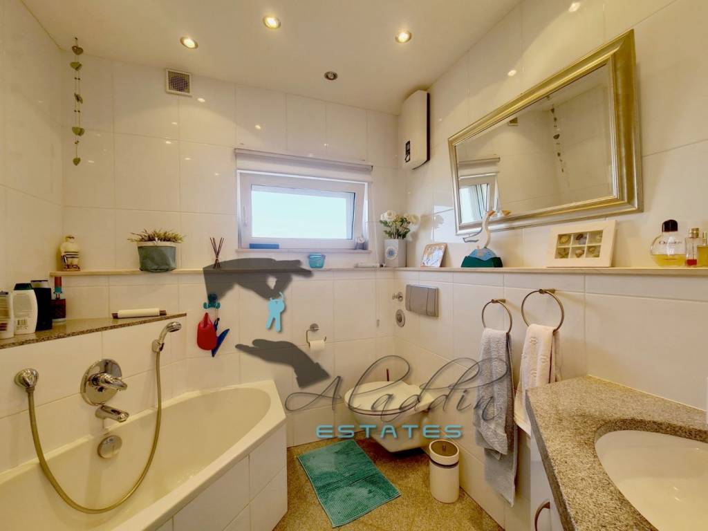 On the first floor, there is a large three-bedroom apartment of 88 square meters of net living area, with two bathrooms, a spacious uncovered terrace of 28 square meters, and a staircase. This apartment has all the prerequisites to be converted, if desired, into two fully functional smaller apartments. In front of the apartment and above the garage, there is an additional luxurious fenced terrace of 42 square meters with an unparalleled sea view.