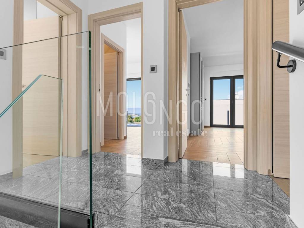 Ground Floor – 63 m²: Spacious open-plan living room, dining area, and a top-quality Italian "NOLTE" kitchen, access to a large terrace with electric awning and sea view, guest toilet, and storage room.