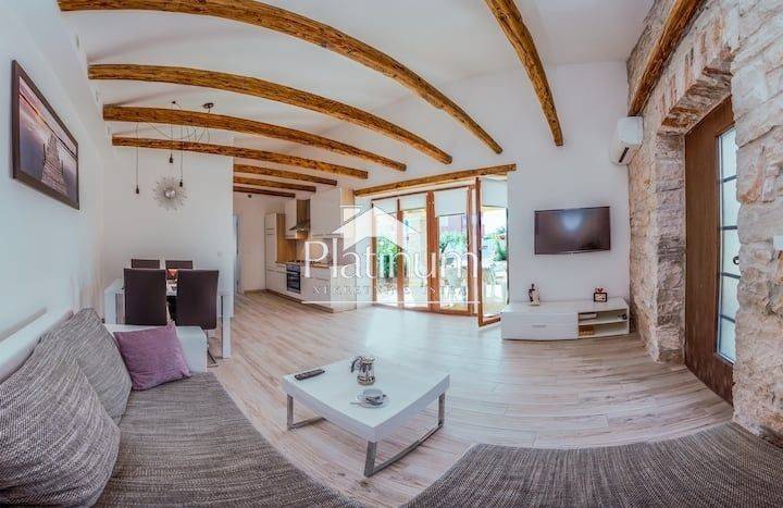 Pula Veli vrh Iznamljujemo stan 42m2 u prizemlju sa terasom 21m2. Stan se sastoji od dnevnog biravka, blagovaone sa kuhinjom, kupaone i spavace sobe. Stan se iznajmljuje namjesten. Cijena 500e mjesec + struja i voda (smece i komunalije u cijeni).