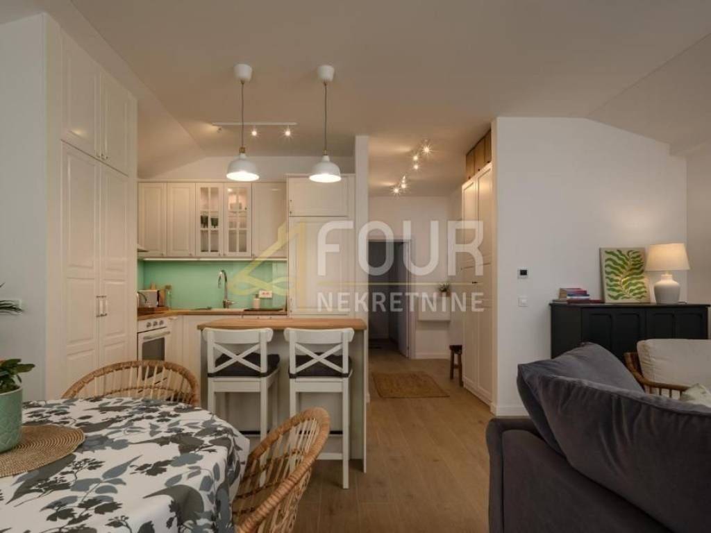 The interior features a functional open space connecting the kitchen, dining area, and living room, while the bedroom and bathroom provide privacy and tranquility. The apartment is fully furnished and equipped, ready for immediate move-in or rental.
