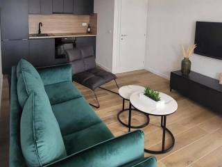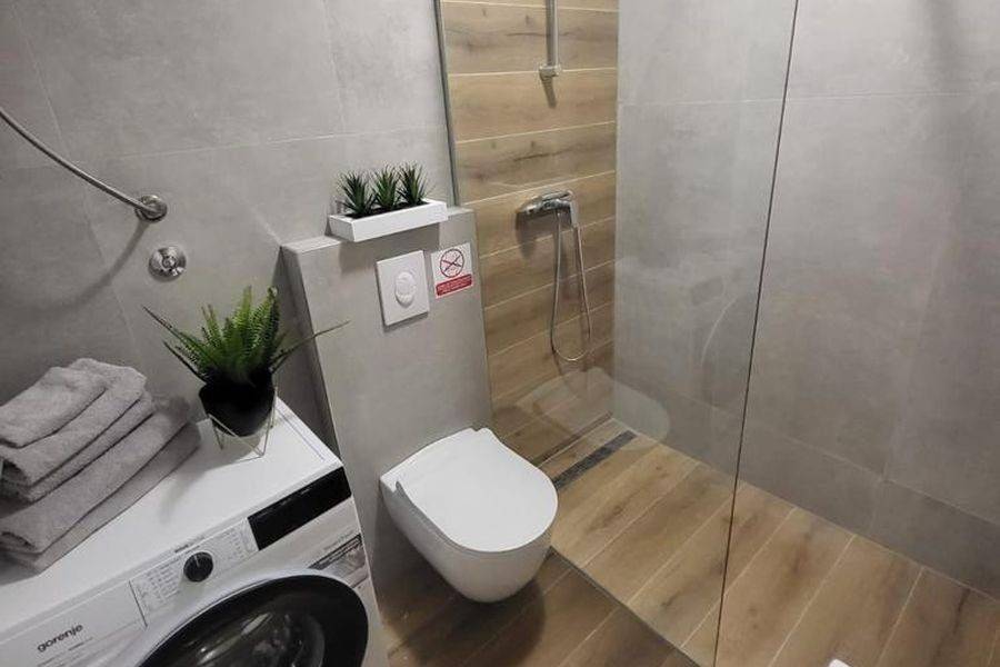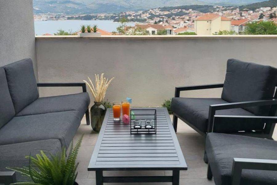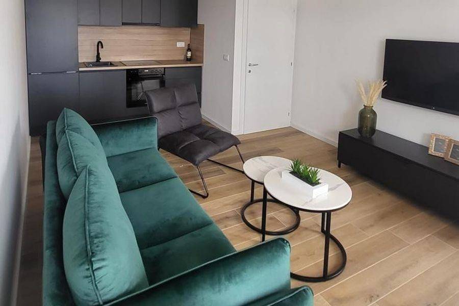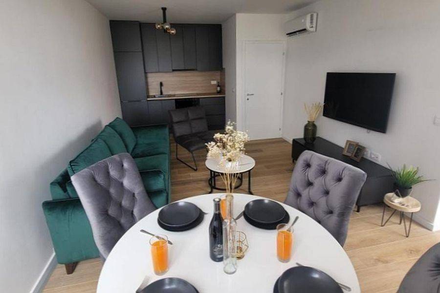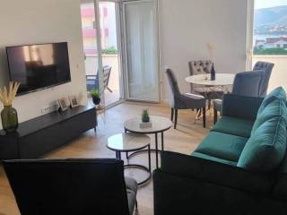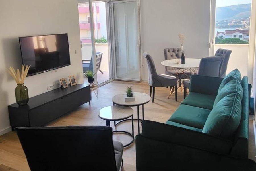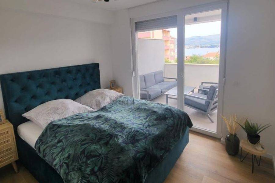 A modern one bedroom apartment in a new building in Okrug Gornji, with a sea view and a garden, for short term rental. It is located on the ground floor of a small residential building and is surrounded by newly built modern buildings.   The apartment has 38,80 m² of living space and 25,20 m² of outdoor space and consists of an entrance area, a living area consisting of a kitchen, dining room and living room, as well as a bedroom and a bathroom. The outdoor space includes a covered and uncovered terrace and two gardens.   The apartment is air conditioned and fully furnished and equipped and is rented as such. It has an outdoor parking space, and the pool is available for shared use by all tenants. The apartment also has two gardens, and a barbecue is available for use. The equipment includes security doors and video surveillance.   The apartment is an excellent choice for urban living because all necessary amenities are located within 500 m, and the airport is about 8,5 km away.