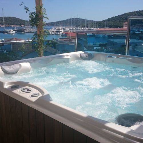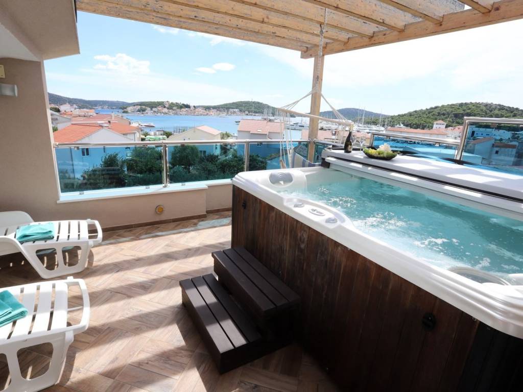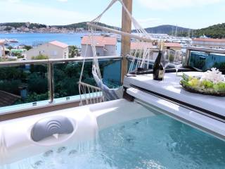 Kuća sa 4 apartmana kategorizirana 4 zvjezdice sa pogledom na more, kompletno namještena, jacuzzi, udaljena 80 metara od mora (plaže) i šetnice, u blizini marine Frapa, ukupno okućnica 1000 m2, (još jedno gradilište od 600 m2) vlasništvo 1/1, mogućnost etažiranja na 4 zasebna stana po građevinskoj dozvoli (odvojena struja i voda)