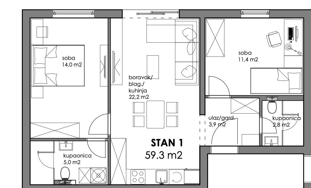 Trosoban stan površine 59,30 m2 smješten u prizemlju.