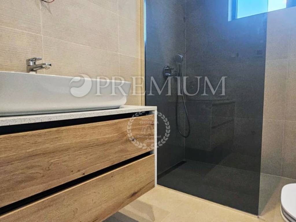 The property boasts top-quality construction, a modern design, solar system preparation, ALU joinery, air-conditioning in all rooms, and underfloor heating in the living room and bathrooms. Flooring is of high-quality ceramic tiles (in the living room and bathrooms), while bedrooms have parquet flooring.