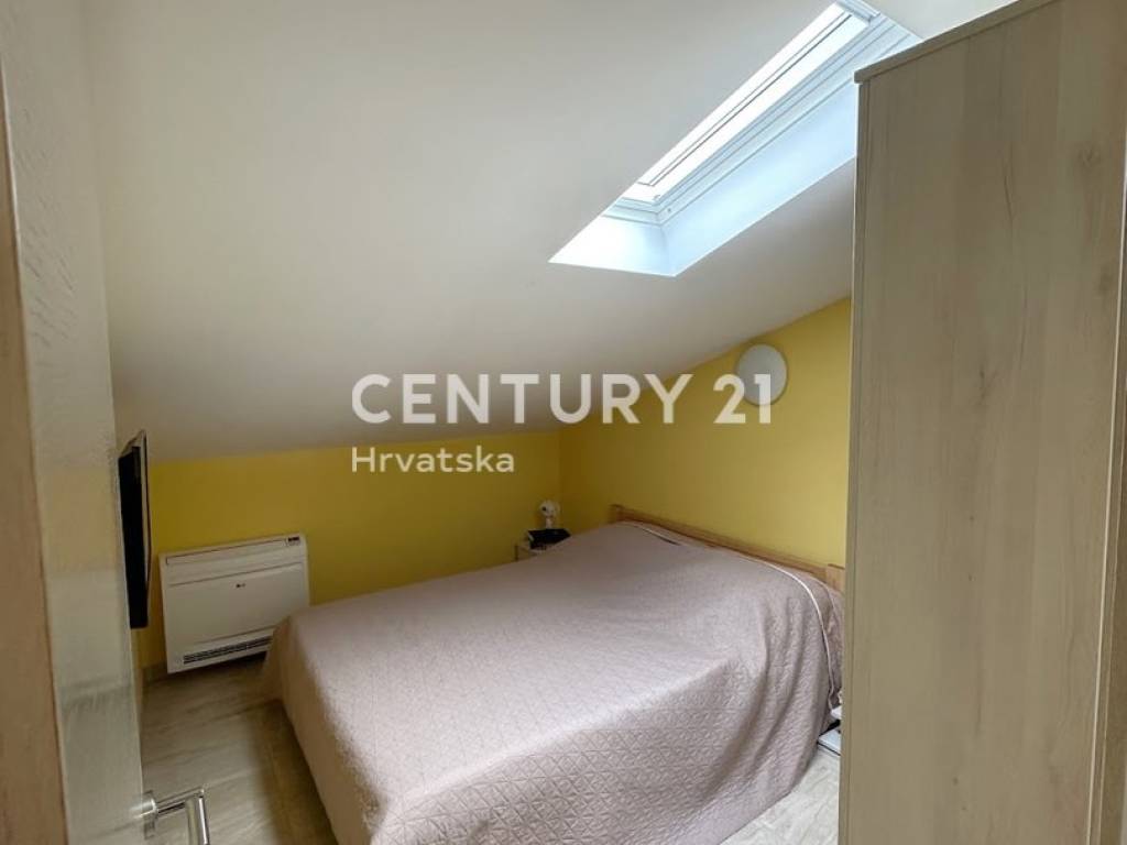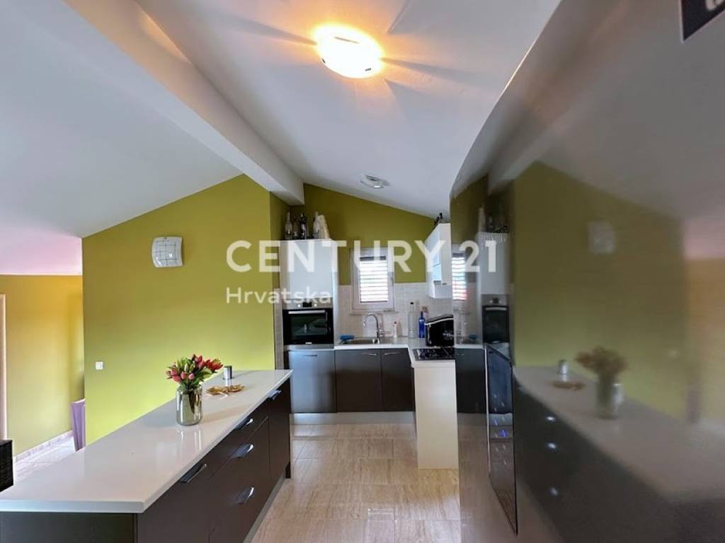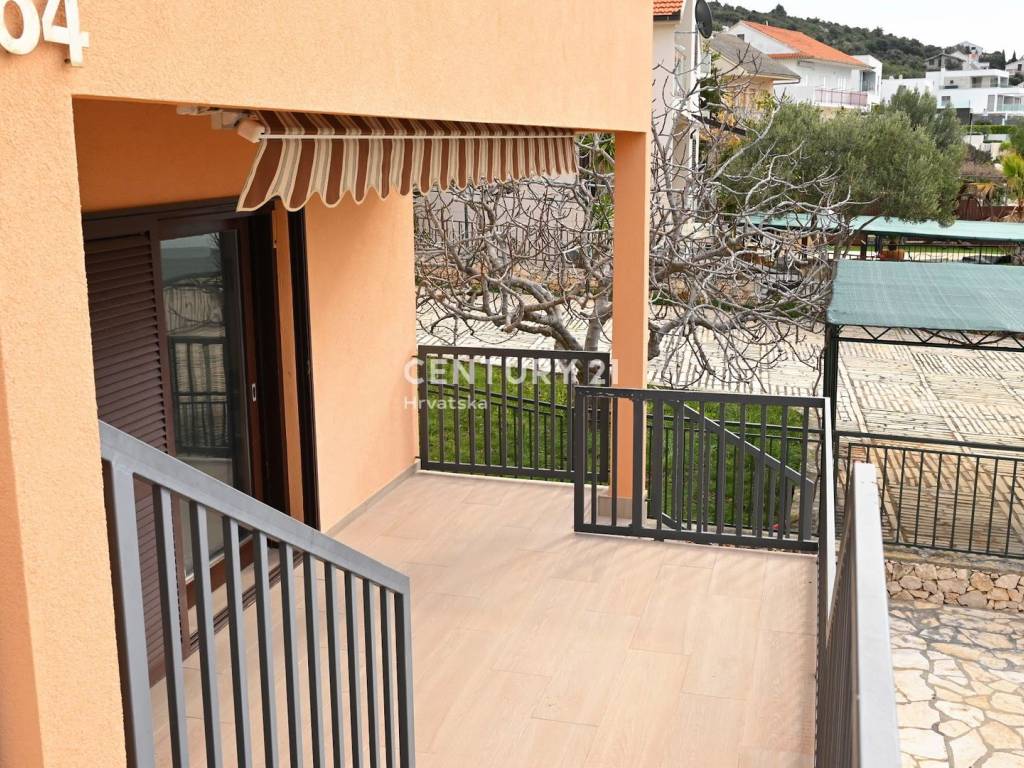 An external staircase leads to the second floor, where there are three bedrooms, a bathroom, living room, dining room, and kitchen. From the terrace, there is a beautiful view of the sea and Rogoznica bay. On the top floor, there is also a separate studio apartment consisting of a bedroom, bathroom, and kitchen with a living room. The house is sold fully furnished.