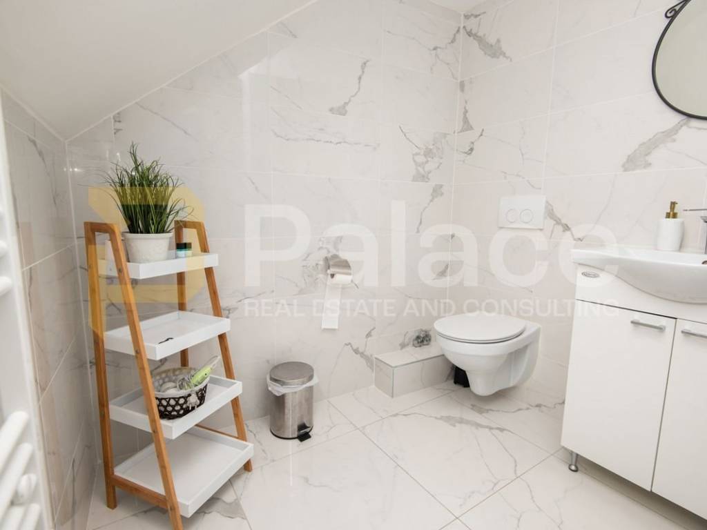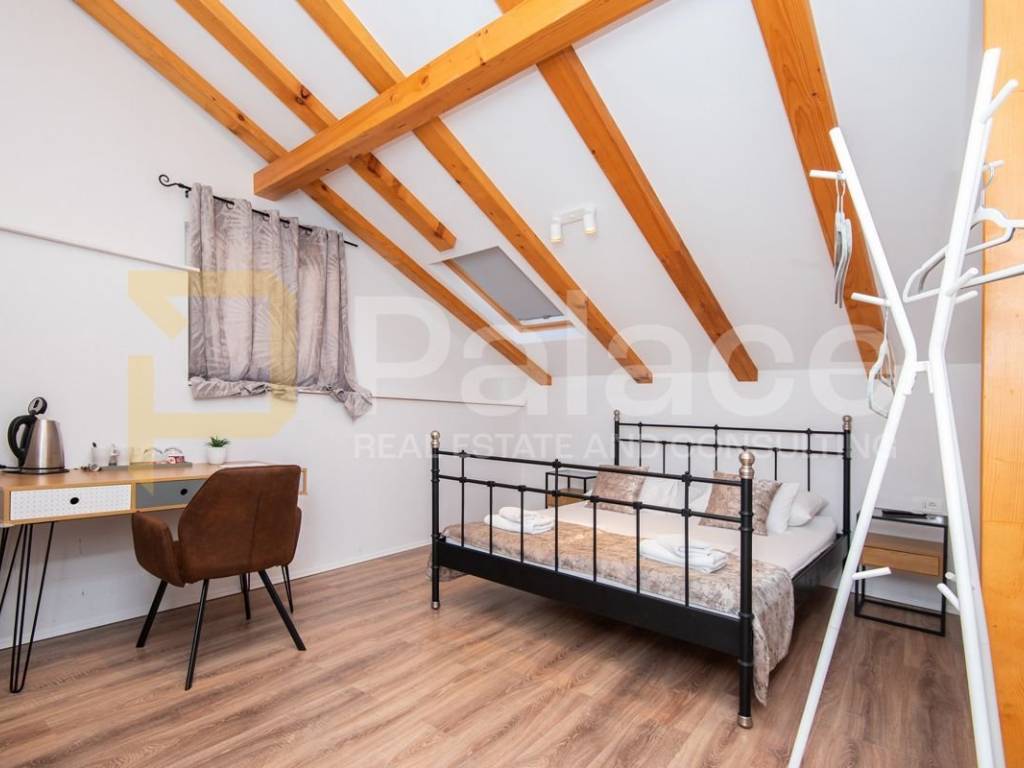 The first floor features six rooms, as well as a laundry room, while internal stairs lead to the upper floor, or attic, where three more rooms are located – one of which has two bedrooms, ideal for families or groups. The view from the upper hallway offers a special experience, as the window opens up to the dome of the Cathedral of St. James – a breathtaking sight that daily reminds of the beauty of this historic city.
