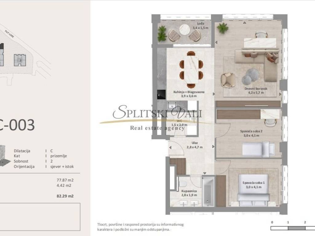 Projekt Lora - Luksuzna novogradnja u užem centru Splita. Ovo je prva zgrada u Splitu s uvedenim plinskim sustavom, vodenim grijanjem i multi-split klimatizacijom, čime se osigurava maksimalna energetska učinkovitost i komfor stanovanja. Zgrade projekta Lora po standardu i dizajnu usporedive su s hotelima s pet zvjezdica. U sklopu projekta bit će recepcija i teretana namijenjene stanarima. Projekt obuhvaća više građevinskih cjelina: - Glavni neboder: dvije podzemne etaže parkirnih mjesta, suteren, prizemlje i 10 katova- Dvojna zgrada: dvije podzemne etaže parkirnih mjesta, suteren, prizemlje i 6 katova- Manji stambeni objekt: dvije podzemne etaže parkirnih mjesta, suteren, prizemlje i dva kata.Stan C203- Dvosoban prostran stan, ukupne površine 82.29m2 smješten u prizemlju zgrade od ukupno 6. katova. Stan se sastoji od dvije spavaće sobe , kupatila, wc-a, kuhinje s blagovaonicom , dnevnog boravka i loggie. Velike staklene stijene pružaju obilje prirodnog svjetla i dodatno naglašavaju prozračnost prostora. Orijentacija stana je Sjever- Istok. Stanu pripada dva parking mjesta u garaži, po cijeni od 35.000€, te mogućnost kupnje spreme koja se nalazi u suterenu zgrade po cijeni od 22.000€.Razgled nekretnine moguć je isključivo uz potpisani Ugovor o posredovanju, a što je u skladu sa Zakonom o zaštiti podataka i Zakonom o posredovanju i prometu nekretninama. Kupac plaća posredničku naknadu od 2%+pdv. Za više informacija obratite se na broj 0991600441 Antonija