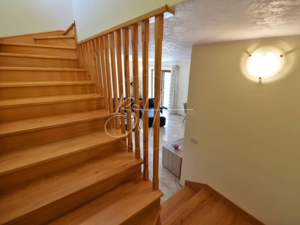 On the upper floor there are two bedrooms and an additional bathroom, and one of the rooms has access to a balcony with a view of the peaceful nature and greenery.