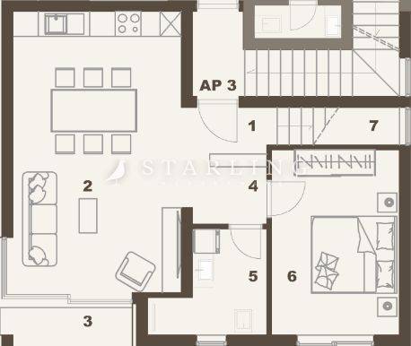 For sale is a luxurious two-story apartment with a total area of 124 m², spanning the first and second floors of a modern new building in Volme, a peaceful neighborhood known for its proximity to the sea and greenery.