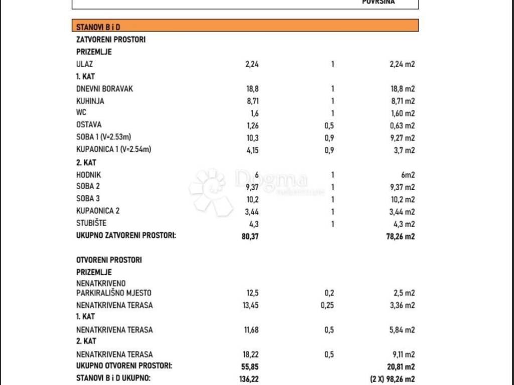 In Vrsi, a quiet coastal village near Zadar, a modern two-story apartment B is for sale in a new, high-quality building, just 300 meters from the sea. The apartment is spread over two floors, with a total net area of 98.26 m². The lower floor consists of a spacious living room with a kitchen and dining room, a pantry, a toilet and one bedroom, while the upper floor has two bedrooms, two bathrooms and a hallway. The apartment has three terraces that allow you to enjoy the sun and the view of the surroundings throughout the day. The building was built according to the highest energy efficiency standards - A+ class, with aluminum joinery and triple-layer insulated glass and a heat pump for heating and cooling. Top-notch insulation and a modern air conditioning system guarantee low utility costs and a pleasant stay throughout the year. Located in a quiet part of Vrsi, the project combines contemporary architecture, functionality and proximity to the sea. Apartment B is an ideal choice for family life, seasonal vacation or investment in tourist rental. ID CODE: DA100066150 Lovre Čavara Agent s licencom Mob: 091/618-1711 Tel: 023/551-400 E-mail: lovre.cavara@dogma-nekretnine.com www.dogma-nekretnine.com Mateo Čirjak Asistent u posredovanju Mob: 095/810-4649 Tel: 022/646-360, 022/646-361 E-mail: mateo.cirjak@dogma-nekretnine.com www.dogma-nekretnine.com