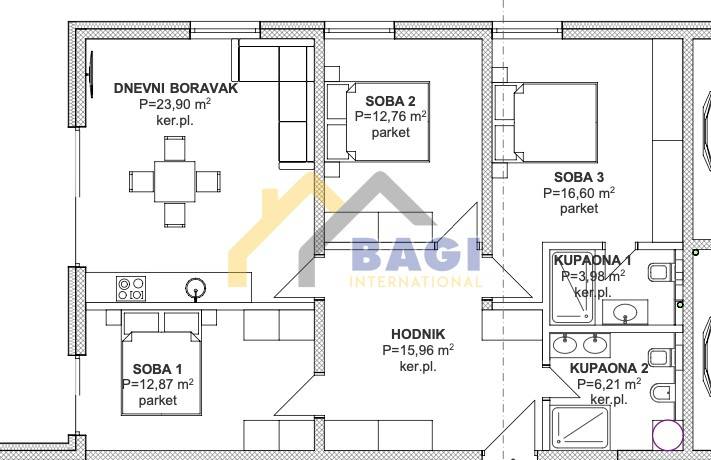 The mentioned apartment is located on the ground floor of the building and consists of three bedrooms, two bathrooms and a living room with a kitchen and a dining room with a living area of 91 m2. The apartment will have an exit to its own private yard, where the swimming pool will be located. The property also owns a parking space located in the building's garden.