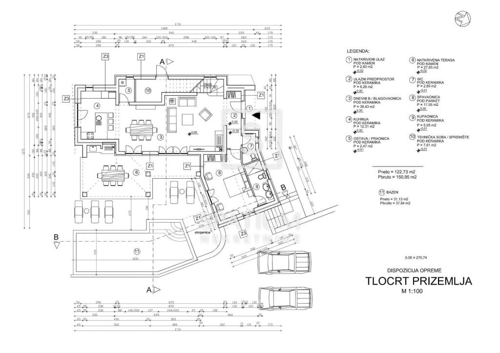 The construction features the highest quality materials, including authentic natural stone on part of the façade and around the entire pool terrace, tiles on all indoor floors, and high-quality wooden parquet in all bedrooms.