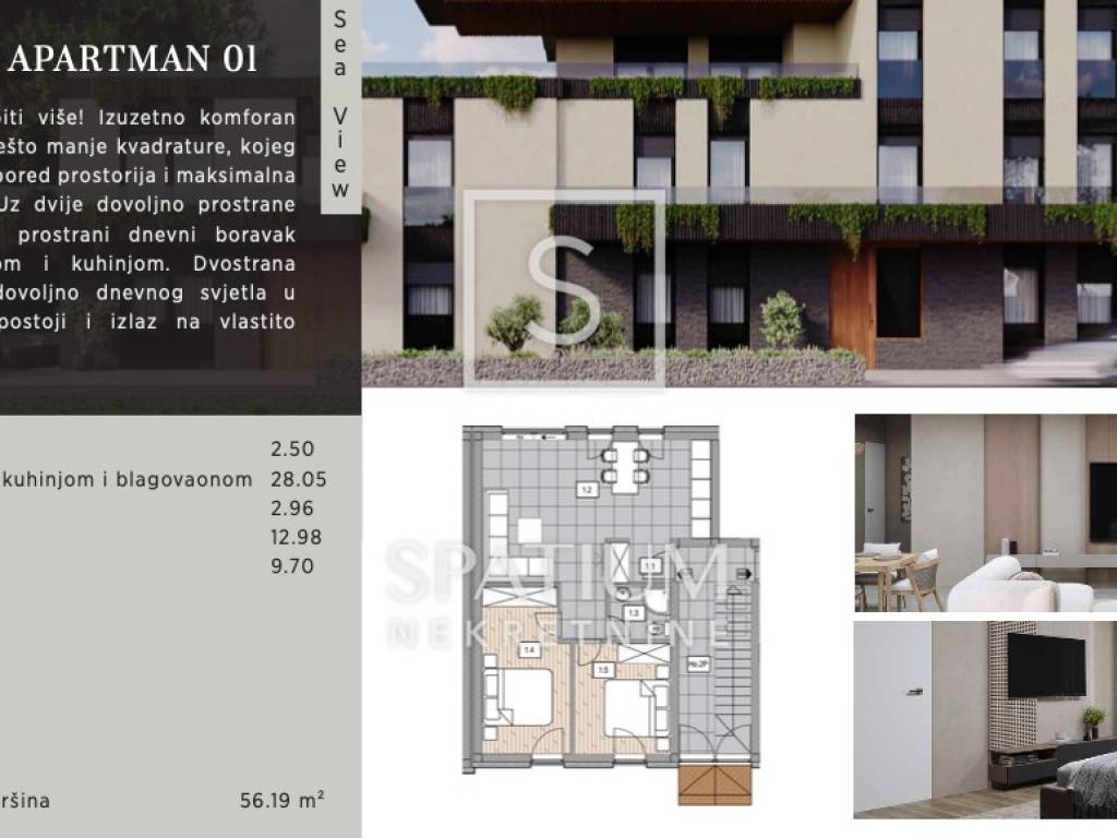 POREČ - FRATA, we are offering a modern 2 bedroom + living room with a total area of 131.29 m2 with a view of the sea in a superb new building with only six apartments. The apartment is located on the 1st floor. In its 97 m2 of interior space, there are two bedrooms, bathrooms, an "open space" kitchen with a dining room and a living room that leads to a large terrace of 35 m2 with a panoramic view of the greenery and the sea. The heating is underfloor, and cooling is provided by air conditioners. High-quality ALU carpentry, first-class ceramics and sanitary ware are just some of the features of this modern apartment. There is still the option of choosing certain details for buyers so that the apartment can be adjusted to their taste. The planned completion of the works is March 2025. The apartment also has 2 parking spaces. Just a few minutes' walk away, you will find everything you need for life, such as shops, promenades, restaurants, 5 minutes' drive to the first beaches and 10 minutes to the beautiful city of Poreč. Frȁta (ital. Fratta), a village at the foot of the southern slopes of the hill on top of which is the village of Tar, (45º18′N; 13º38′E; 51 m above sea level); 86 inhabitants (2021), Tar-Vabriga municipality. Physiognomically, it has merged with Tara, so it forms its southern suburb. The inhabitants are engaged in traditional agriculture (cultivation of olives, vines and fruit), and some of them work in tourism and service activities. The area was inhabited in prehistory and antiquity. Please feel free to contact us for any additional information. Sanjin Latinčić Licensed agent +385 91 28 99 599 sanjin@spatium.hr Spatium nekretnine +385 51 272 903 info@spatium.hr