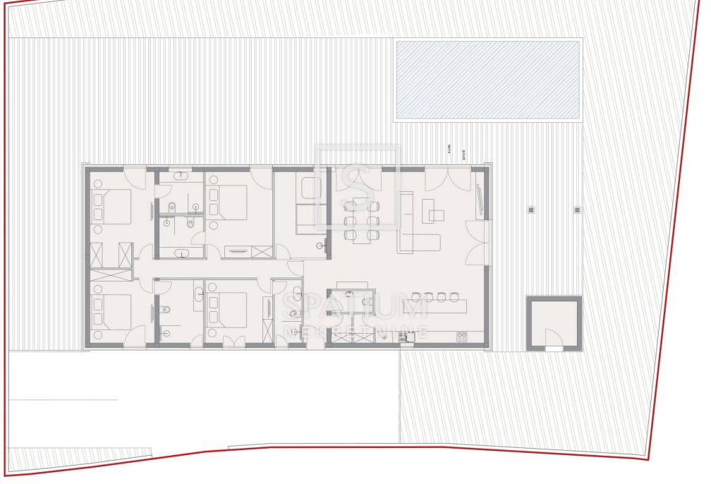 The interior space would be occupied by a spacious living room with kitchen and dining area, technical rooms, toilet and four bedrooms, each with its own bathroom.