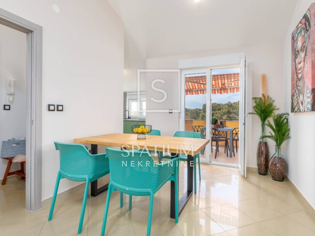 FAŽANA, we are pleased to present an apartment on the third floor of a building with a total area of 75.77 m². It consists of an entrance hall, a spacious living room with dining area, hallway, two bedrooms, a bathroom, a kitchen and a storage room, with the added value of a loggia and a private parking space in the courtyard of the building. The apartment is fully furnished, equipped with all necessary appliances, and immediately ready for moving in or for tourist rental.