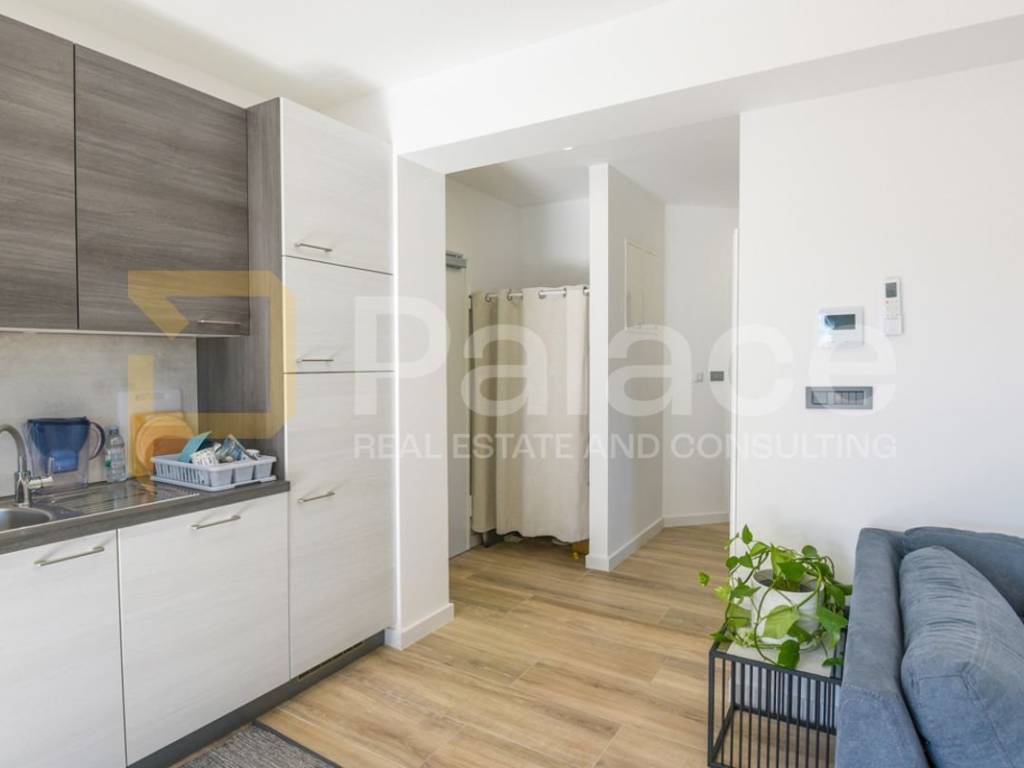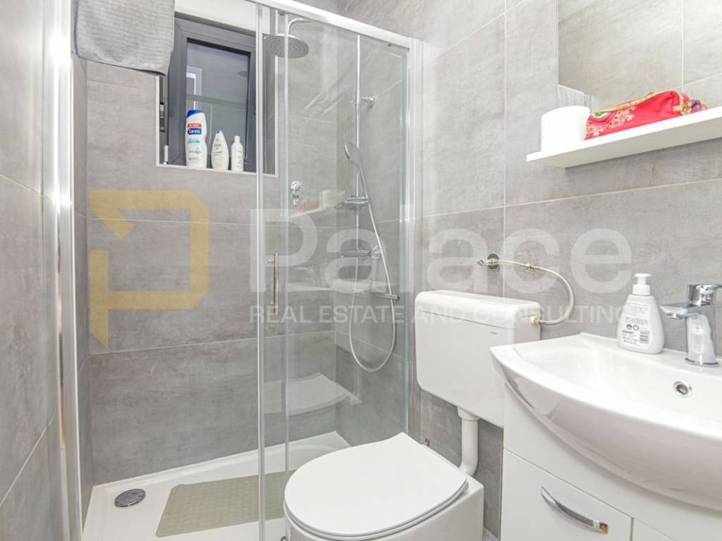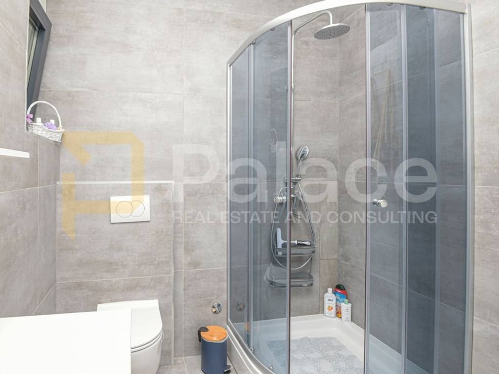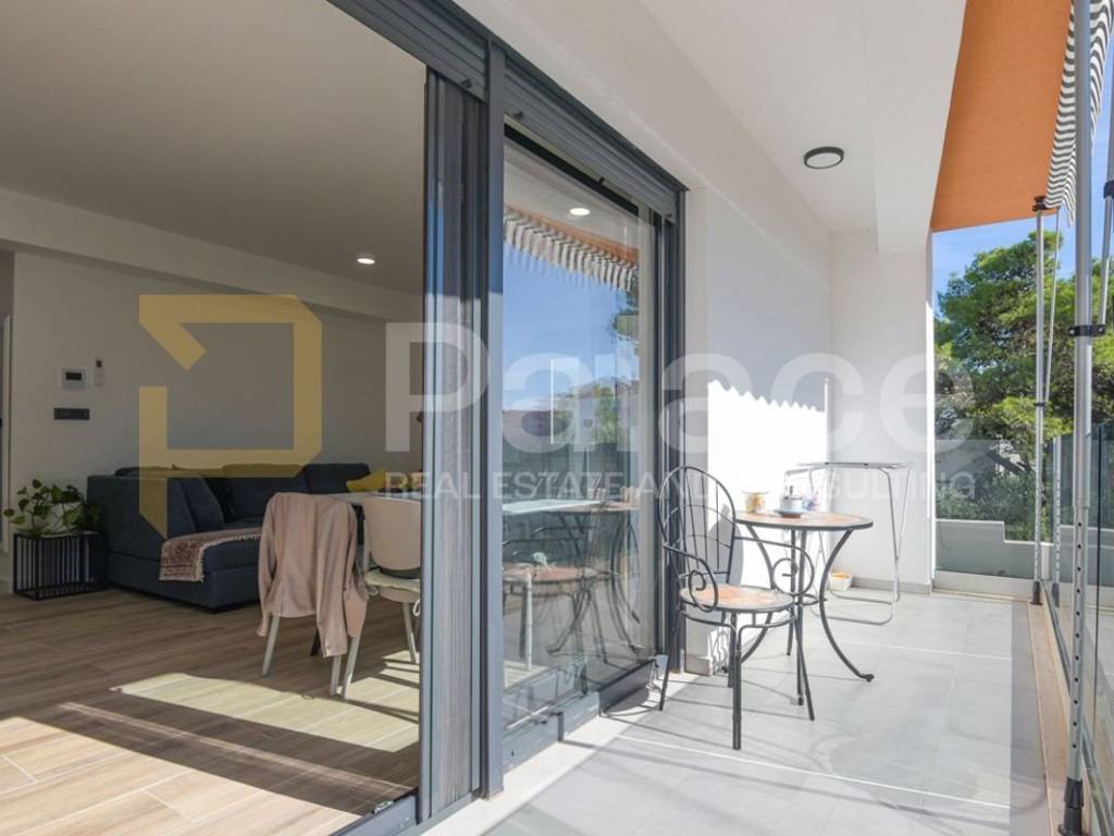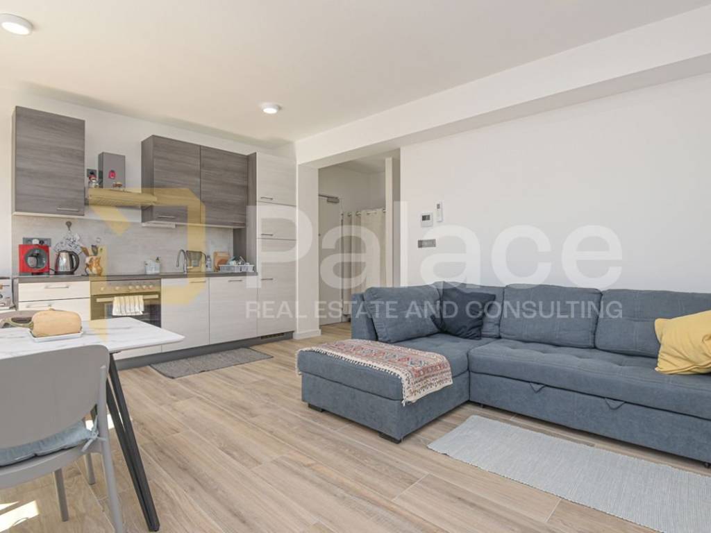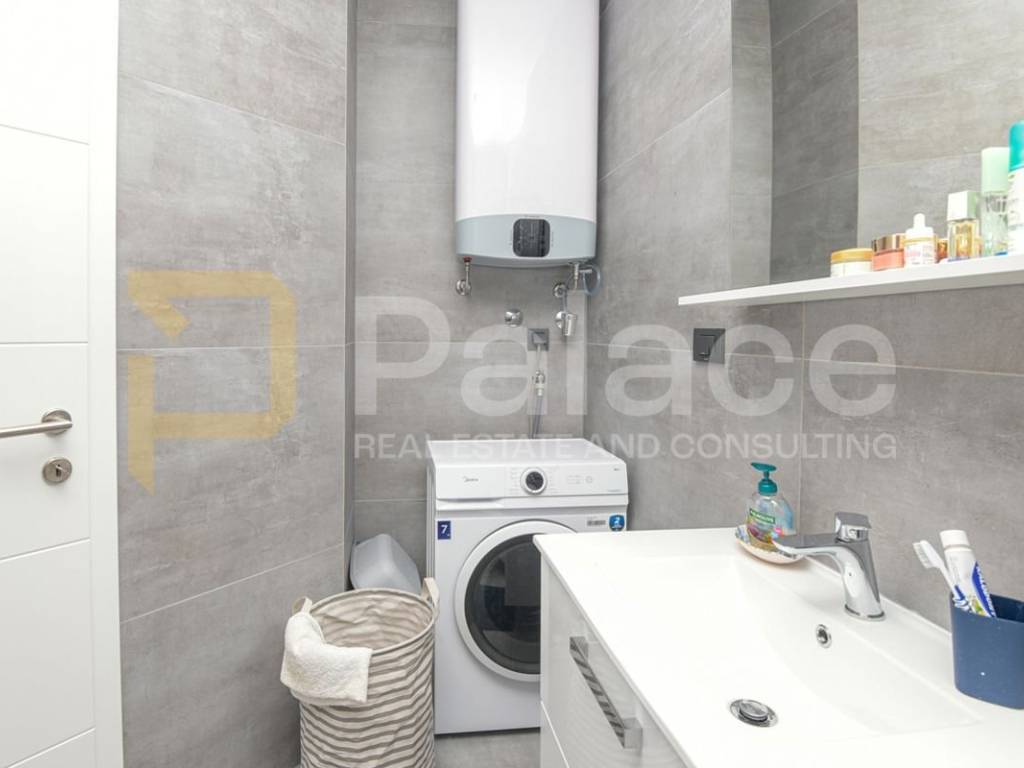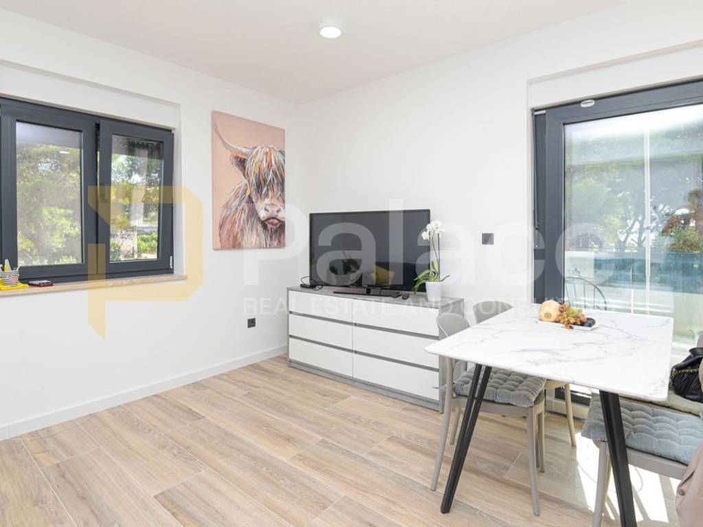 The apartment is located on the ground floor of a new building and consists of an entrance hall, two bedrooms - one with its own bathroom, an additional bathroom, a kitchen with a living room and access to a sunny terrace with a sea view. The terrace leads down to the garden. The apartment includes one private parking space.