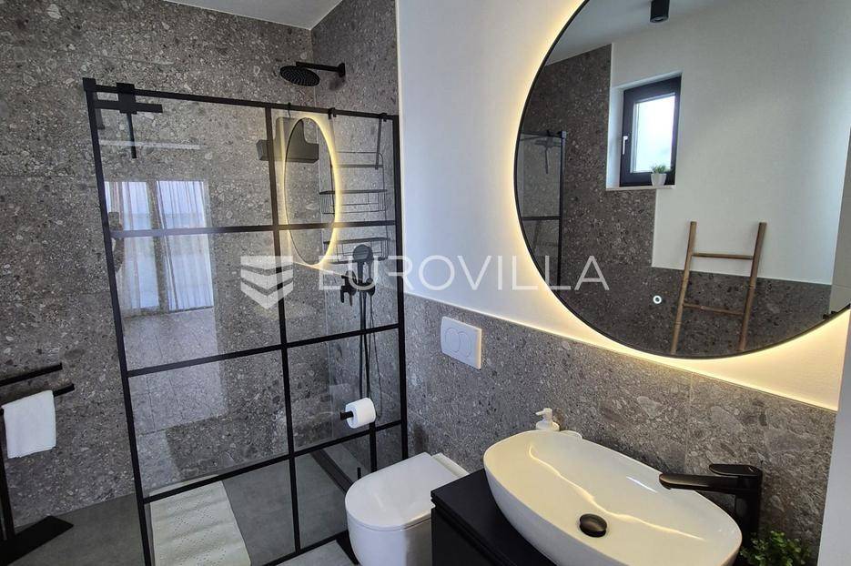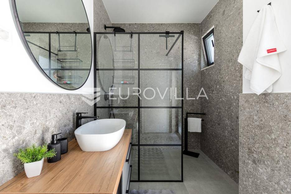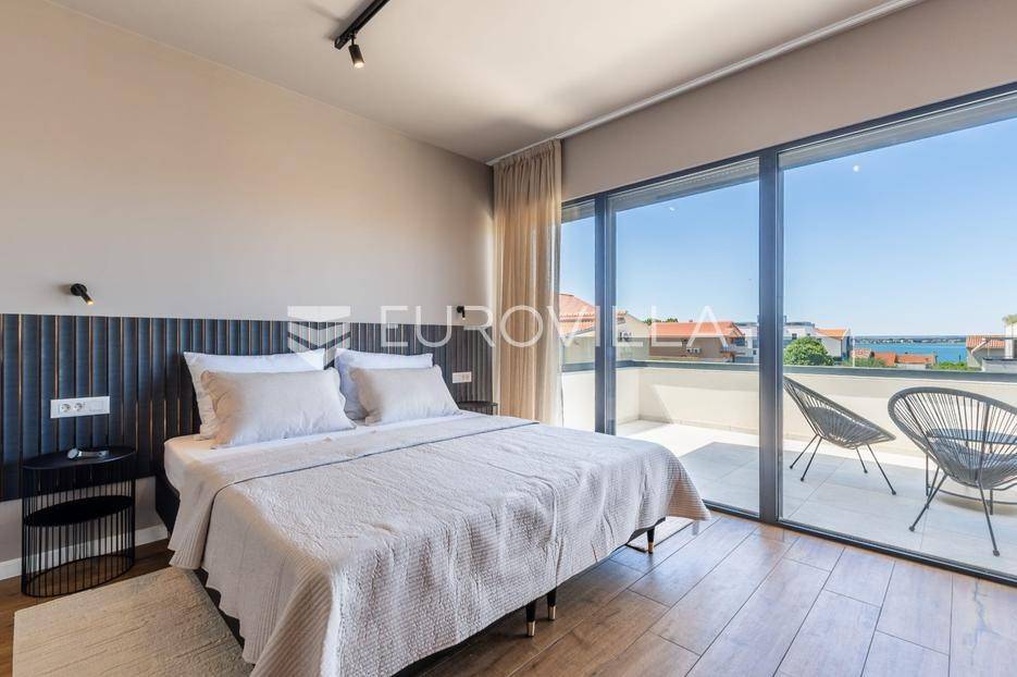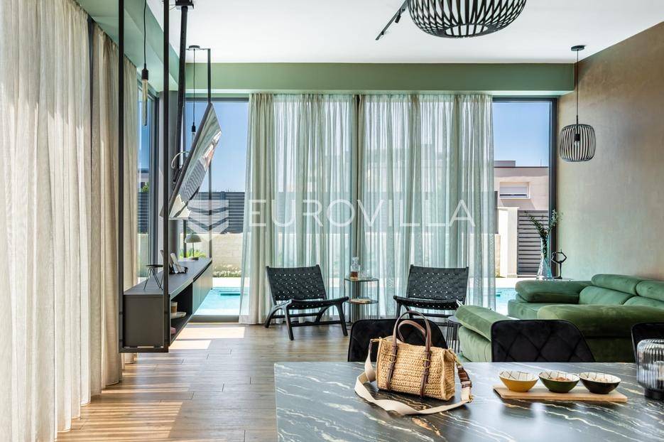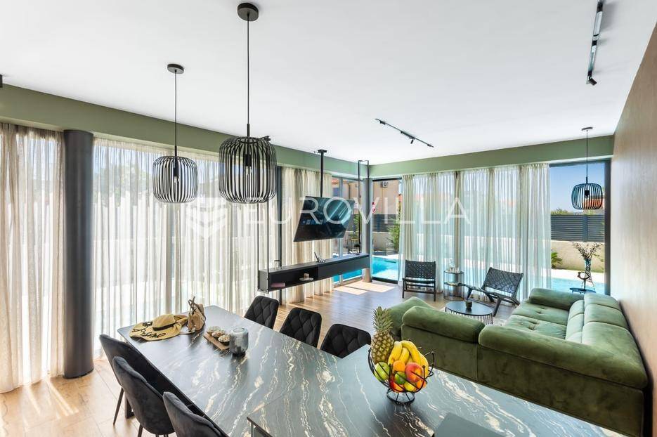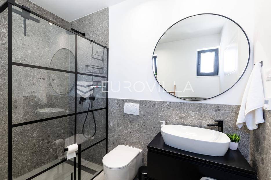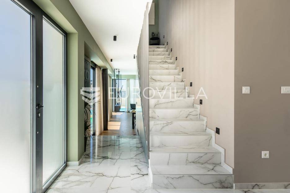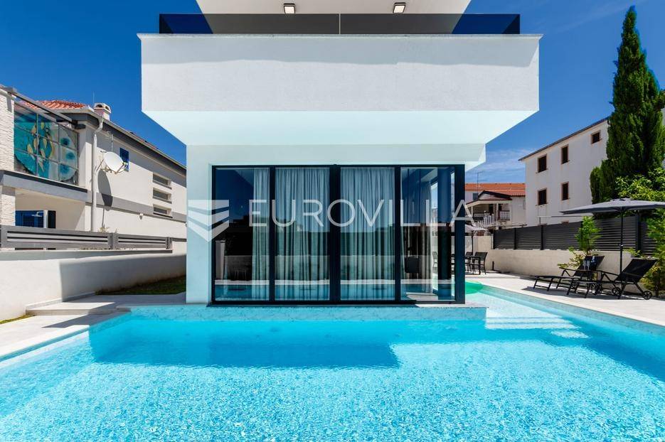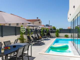 Predstavljamo vam ovu prekrasnu i potpuno opremljenu vilu s bazenom u malom mjestu pokraj Zadra, Vrsima koja je udaljena svega 150 metara od mora, uređene lokalne plaže te svih ostalih potrebnih sadržaja ključnih za kvalitetan život ili odmor.Vila je ukupne neto površine 160m2, dok njena bruto površina iznosi 261m2. Sastoji se od prizemlje, kata i prostrane krovne terase s jacuzzijem i ljetnom kuhinjom.Na prizemlju površine 92,40m2 se nalazi komforna kuhinja s blagavaonicom, dnevni boravak, kupaonica, hodnik te stubište kojim dolazimo na 1. kat.Prvi kat površine 96,5m2 se sastoji od tri spavaća sobe s en suite kupaonicama, od kojih je jedna master spavaća soba, te hodnika i balkona površine 13,9m2.Prekrasna krova terasa površine 72,80m2 je opremljena jacuzzijem i ljetnom kuhinjom, a s nje se pruža pogled na more koji će vas očarati.Uz to, u dvorištu vile se nalazi i bazen površine 53m2, garaža i spremište od 32m2, te vanjski parking, ljetna kuhinja i roštilj.Vrsi Mulo je slikovito naselje smješteno na sjeverozapadnom dijelu Dalmacije, nedaleko od grada Nina. Poznato je po prekrasnim plažama s kristalno čistim morem i mirnom atmosferom koja privlači mnoge turiste. Mjesto zadržava šarm tradicionalnog dalmatinskog sela, s uskim ulicama i kamenim kućama. U blizini se nalaze brojne prirodne i kulturne znamenitosti, poput Velebita i povijesnog grada Zadra.Dodatne informacije - udaljenost od važnijih lokacija:More: 150m / Plaža: 150m / Mjesto za brod: 300mKupovina: 300m / Ugostiteljski objekti: 250m / Ljekarna 800mZadar: 22km / Zračna luka: 33km / Autocesta: 23kmZa više informacija te dogovor o razgledavanju, budite nas slobodni kontaktirati