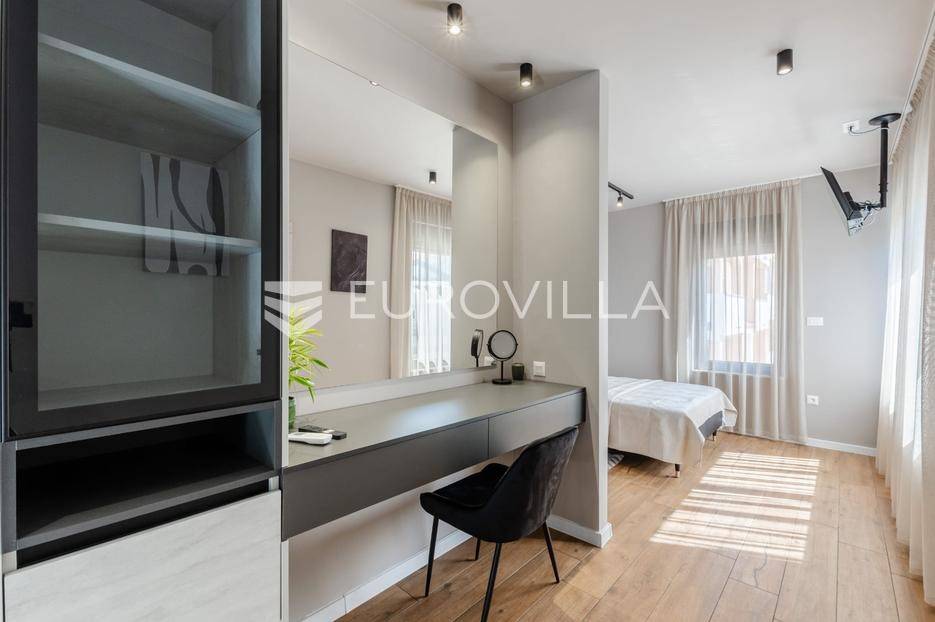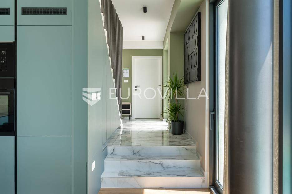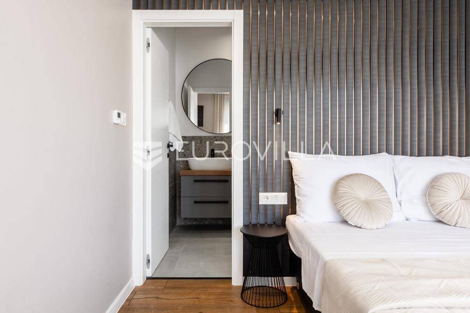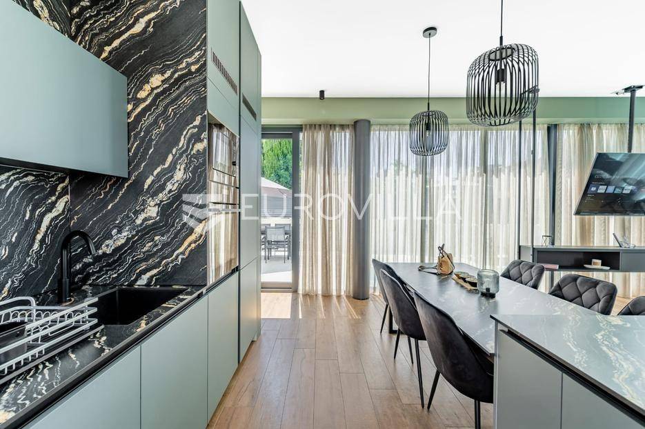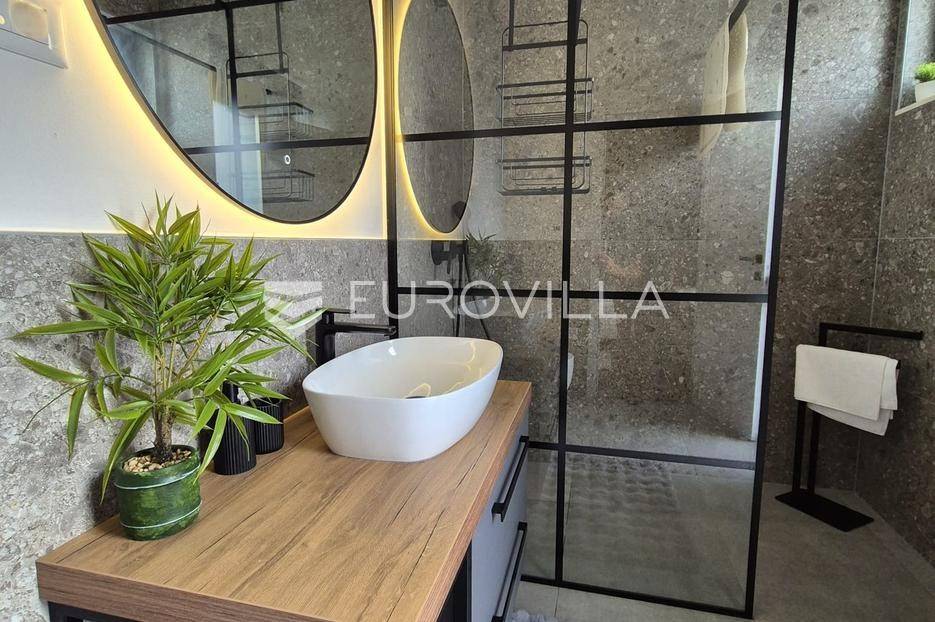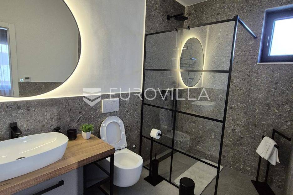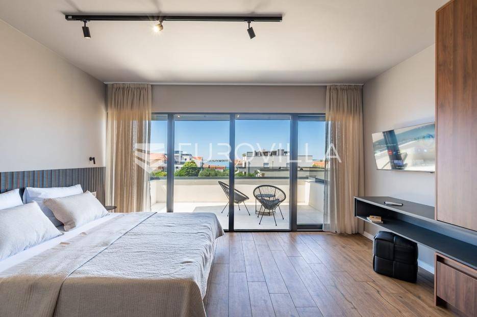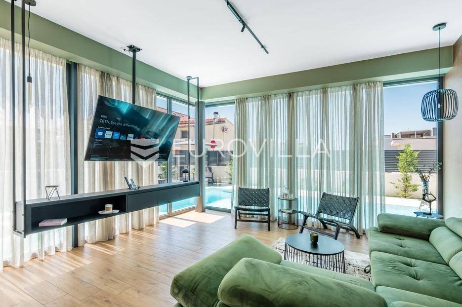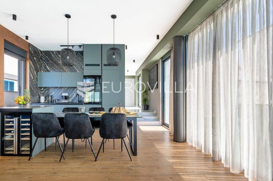 Predstavljamo vam ovu prekrasnu i potpuno opremljenu vilu s bazenom u malom mjestu pokraj Zadra, Vrsima koja je udaljena svega 150 metara od mora, uređene lokalne plaže te svih ostalih potrebnih sadržaja ključnih za kvalitetan život ili odmor.Vila je ukupne neto površine 160m2, dok njena bruto površina iznosi 261m2. Sastoji se od prizemlje, kata i prostrane krovne terase s jacuzzijem i ljetnom kuhinjom.Na prizemlju površine 92,40m2 se nalazi komforna kuhinja s blagavaonicom, dnevni boravak, kupaonica, hodnik te stubište kojim dolazimo na 1. kat.Prvi kat površine 96,5m2 se sastoji od tri spavaća sobe s en suite kupaonicama, od kojih je jedna master spavaća soba, te hodnika i balkona površine 13,9m2.Prekrasna krova terasa površine 72,80m2 je opremljena jacuzzijem i ljetnom kuhinjom, a s nje se pruža pogled na more koji će vas očarati.Uz to, u dvorištu vile se nalazi i bazen površine 53m2, garaža i spremište od 32m2, te vanjski parking, ljetna kuhinja i roštilj.Vrsi Mulo je slikovito naselje smješteno na sjeverozapadnom dijelu Dalmacije, nedaleko od grada Nina. Poznato je po prekrasnim plažama s kristalno čistim morem i mirnom atmosferom koja privlači mnoge turiste. Mjesto zadržava šarm tradicionalnog dalmatinskog sela, s uskim ulicama i kamenim kućama. U blizini se nalaze brojne prirodne i kulturne znamenitosti, poput Velebita i povijesnog grada Zadra.Dodatne informacije - udaljenost od važnijih lokacija:More: 150m / Plaža: 150m / Mjesto za brod: 300mKupovina: 300m / Ugostiteljski objekti: 250m / Ljekarna 800mZadar: 22km / Zračna luka: 33km / Autocesta: 23kmZa više informacija te dogovor o razgledavanju, budite nas slobodni kontaktirati