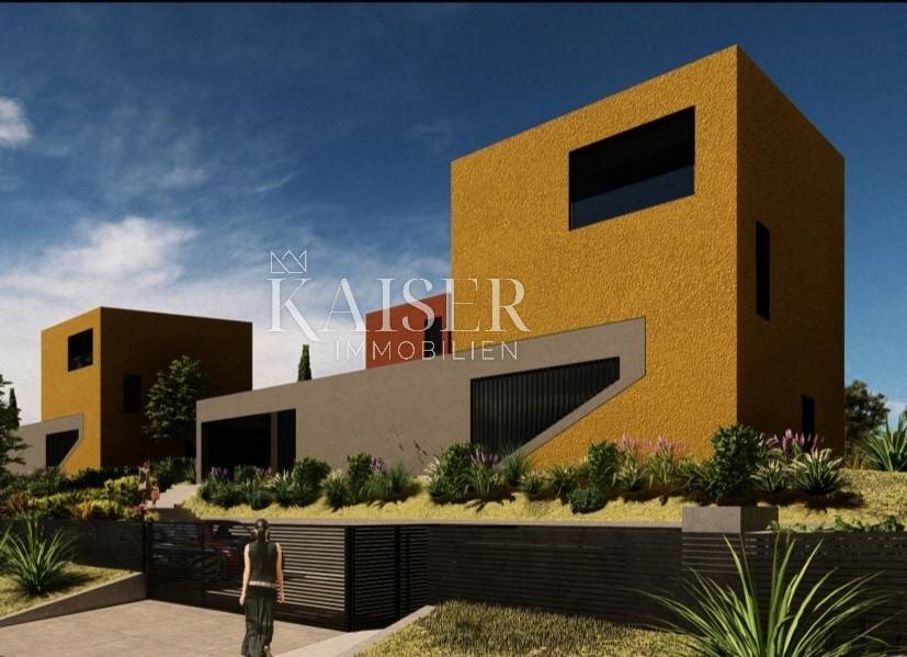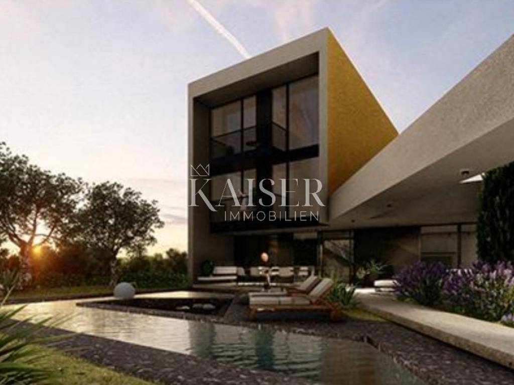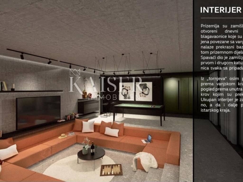 Kaiser Immobilien presents a unique project with a view of the entire central Istria. The location of this luxury project is in the central part of Istria, more precisely a small town above Lake Butoniga and near the beautiful Motovun, a popular tourist destination. These lands are slightly separated from the town itself, which gives them a very peaceful and relaxed atmosphere. We can call this project a refuge in peaceful nature. Land for three modern villas with a pool on a beautiful hill, at 460 m above sea level with a 360-degree view of the Istrian landscape on one side, and Učki on the other, Istria is literally in the palm of your hand. On building plots of 1,370 m2, 1,265 m2 and 1,239 m2, building permits were obtained for family houses of 410 m2 gross area, with a heated pool of 56 m2 gross area. The ground floors are designed as spacious open living rooms, kitchens, dining rooms, which are connected with several glass walls to the exterior where there are beautiful multi-level swimming pools. In that ground floor there is also a wellness area. The sleeping area is designed in "towers" on the first and second floor, in six sleeping units, each with its own bathroom. Each bedroom will be designed for comfort and peace, offering stunning views of the landscape. From the "towers", in addition to the beautiful view of the outside landscape, an inward view of the green extensive roof that covers the first floors is envisioned. The overall interior is designed in a very modern way, while still following the basic ideas of the Istrian region. All expenses are paid, and construction can start immediately. The owner has all offers for the completion of the construction, including horticulture and interior decoration. It is planned to build houses with floors P+2, with a large living room and kitchen, a wellness/sauna area, and a total of 6 bedrooms (2 master bedrooms), each with its own bathroom. Heating and cooling will be provided by a heat pump that will be connected to underfloor heating and fan coils. Installation for a photovoltaic power plant (solar panels) to produce electricity is planned. These modern villas, apart from the basic things it will have premium amenities such as smart homes, climate control and security measures to ensure comfortable and safe living.Access is from an asphalt road with sewerage infrastructure underneath. 4 parking spaces are provided on the plots. For all information, contact your agent.