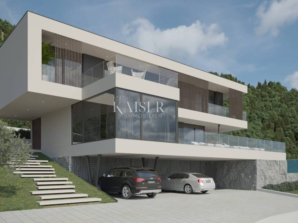 Kaiser Immobilien presents a beautiful villa with a swimming pool, in the immediate vicinity of the sea. It has a total net area of 245.95 m2, which will extend through the ground floor and first floor. Spacious glass walls will adorn the front of the villa to let in plenty of sunlight throughout the day. On the ground floor, there will be an entrance hall, a wellness oasis, a kitchen with a dining room, a living room with access to a spacious terrace with a swimming pool. On the first floor there will be 3 bedrooms with attached bathrooms, a laundry room and access to the terrace with an open and unobstructed view of Kvarner.