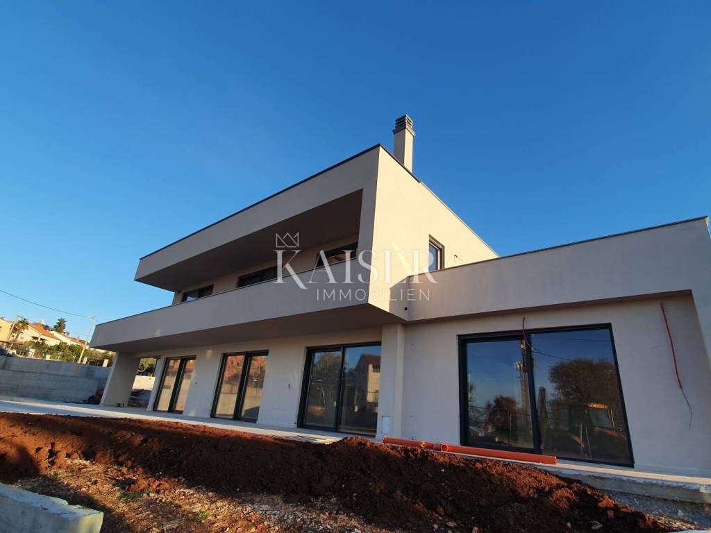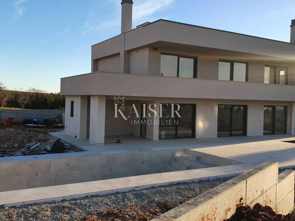 Kaiser Immobilien proudly presents a real beauty among villas., a modern and elegant villa with a swimming pool and sauna and with a beautiful view of the sea and the Austrian Alps. The villa is located in an ideal location only 10 km from the city of Poreč and the first beaches, and close to all the necessary amenities for life., market, school, kindergarten, restaurant that you will easily visit on foot without starting the car. This imposing villa stands gracefully as a detached building on a plot of 979 m2 and is surrounded by a quiet village, beautiful views and green areas. The area of the villa's inner net part is 240 m2, if we add the terraces we arrive at an area of 433 m2. The villa enchants with its perfect balance between contemporary design and modern elements. The exterior and interior of the villa are connected by a very modern design with a spacious and beautifully landscaped lawn with Mediterranean plants and a pleasant heated pool of 40 m2. The villa is a combination of modern design in a natural environment. The villa consists of a ground floor and a first floor, and the special feature of this villa is its spacious roof terrace, measuring 97 m2, which offers a breathtaking view of the sea, the Alps and the village around the villa. The ground floor of the villa is decorated with 1 bedroom with 1 bathroom and its own walk-in wardrobe, kitchen, living room, dining room, 1 guest toilet, storage room and a machine room that has an entrance from the outside and where everything is regulated for Daikin heat pumps, pool heating and underfloor heating. On the first floor of the villa there are 3 more bedrooms with 3 bathrooms, each room has an exit to a balcony, and one bedroom has another additional balcony for itself. Access to the terrace and to the floor inside the villa is provided by internal stairs, which lead to a spacious and beautiful roof terrace with a jacuzzi and sauna, with an irresistible view. The roof terrace provides the possibility of setting up other facilities to make your stay there unforgettable and even more enjoyable. The villa's courtyard will be landscaped with Mediterranean plants, and the entire yard is equipped with irrigation. There is a 40 m2 heated pool, a spacious sunbathing area around the pool and a summer kitchen. additional features: - 4 covered parking spaces, - anthracite black, PVC and aluminum joinery with electric lifts, - electric shutters - heated pool with counter-current swimming - jacuzzi and sauna - insulation - scale-free water softener - water heating - heat pumps Distance from the property to the town: Poreč - Pula Airport, 45 km Poreč - Ljubljana, 162 km Poreč - Vienna, 544 km Poreč - Prague, 868 km Poreč - Munich, 565 km If you are looking for your perfect villa, please contact us with confidence at the phone number 00385 923782803, or at the email address: ivana@kaiser-immobilien.hr. The agency commission is 3% + VAT, and is charged for the first legal act. The villa is subject to VAT and no additional tax is payable on it.