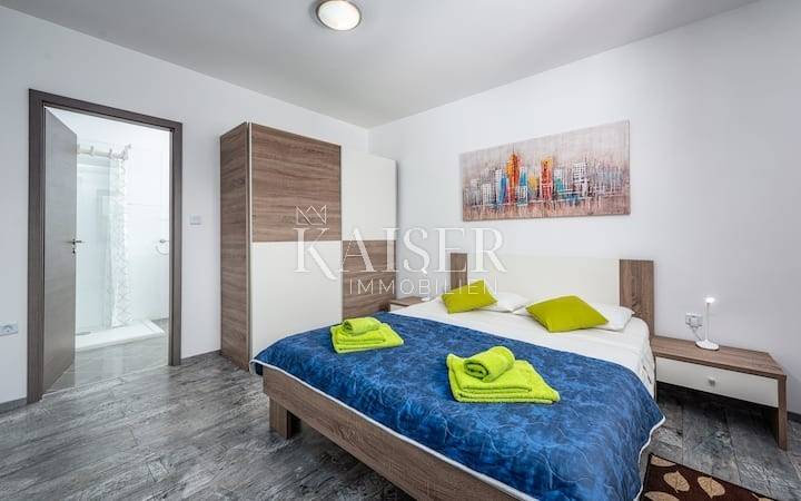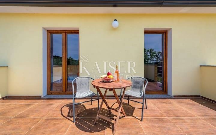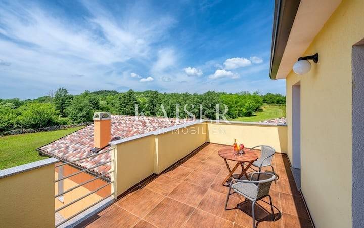 Kaiser Immobilien is selling a beautiful house with a swimming pool located in a small village in central Istria. The large garden of 12,000 m2 allows you to enjoy the beauty of nature in this villa, while at the same time offering you proximity to the most beautiful towns in Istria. All city amenities are located in Pazin, which is about 10 km away, and the accommodation in central Ista provides good traffic connections with the rest of the peninsula. It extends to 300 m2, and the garden is surrounded by dry wall. The ground floor consists of an entrance hall, an open living room with a kitchen and a dining room, on the first floor there are three bedrooms and two bathrooms. In the second part of the house, a separate entrance leads to a separate apartment of 40 square meters, which consists of a living room with a kitchen and dining room, a bedroom and a bathroom. From the living room there is access to a covered terrace and a pool of 50 m2. Not far from the house there is a summer kitchen of 50 square meters and a garage of 40 square meters, which, due to its separation from the house, could be converted into another residential unit. The house has an established tourist rental business that the new owner can take over.