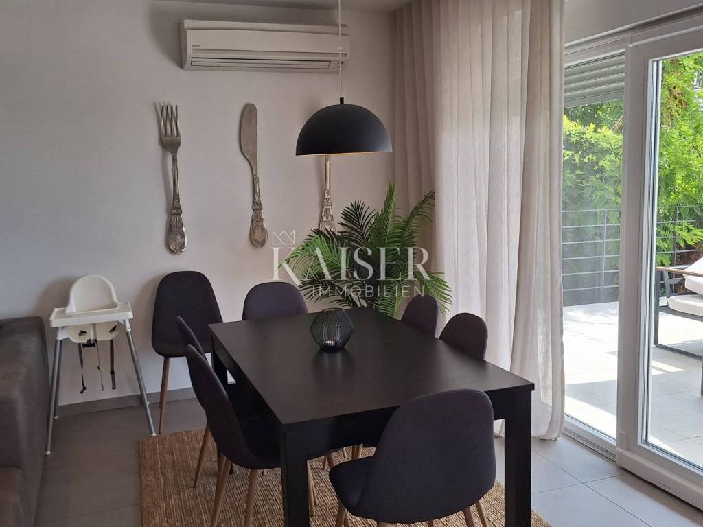 Near the very center of Opatija, a 10-minute walk from the Opatija market, surrounded by Mediterranean greenery, is this family house offered by Kaiser-immobilie in Opatija. Adapted to the cascading terrain, the floor plan of the building has been developed with a basement, ground floor and first floor. In the basement of the building there is a small oasis for relaxation with deck chairs, a Finnish sauna and a bathroom. An external staircase leads to the ground floor, which contains: an open-space kitchen with dining area and living room, all with access to an outdoor terrace overlooking the sea and Kvarner, a small hallway, a bedroom with bathroom and toilet, and a room for a washing machine. An internal staircase leads from the ground floor to the first floor where there are: 3 bedrooms and 2 bathrooms, a small hallway. The rooms have access to a balcony. On the roof of the building there are solar panels to maintain the heat of the house and water. Each room has air conditioning, also heating-cooling. In the garden of the house there is an outdoor pool with heated water, a barbecue and a small garden house. The surroundings of the house are decorated with Mediterranean plants and greenery. The house has 2 parking spaces. There are walking paths for walking through the forest, as well as cycling, in the vicinity of the building. There are also restaurants, cafes, public transport, beaches, and all other facilities important for the functioning and life of a family, which is also the main advantage of this building. Distance from larger centers: Trieste 1h 30 min, Zagreb 1h 40 min, Ljubljana 2h, Krk airport 30 min, Pula 2h, Berlin 10 h, Vienna 5 h approx. drive by car. To view this beautiful modern house, call +385916133776 agent Eli Lovko The agency fee is 3% + VAT and is paid upon the first money transaction.