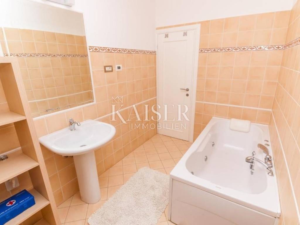 Kaiser Immobilien presents a detached house of almost 400 m2 of living space on 3 floors with 3 separate residential units. The house is located above Lovran, 3 km by car from the city center, coast and beaches, and is surrounded by a landscaped garden with a swimming pool, hot tub and barbecue. On the ground floor of the house there is a two-room apartment with a living room, 2 bathrooms, a tavern, a terrace and a hydromassage pool. On the first floor there is a three-room apartment with a living room, 2 bathrooms and 2 terraces, a barbecue, a swimming pool and a tavern. The second floor contains another two-bedroom apartment with a living room, bathroom, balcony and terrace. The house has a total of 7 parking spaces and a beautiful view of the entire Kvarner. In addition to family life, the house is also suitable for tourist rental, which the owners have been doing very successfully for almost 10 years.