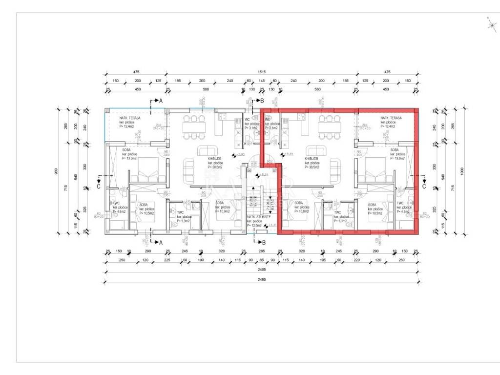 Kaiser Immobilien puts on the market: Modern luxury with a Roof Terrace near the sea Enjoy supreme comfort and a wonderful view of the sea in this exclusive building with 7 luxury apartments, located just a few steps from the pristine beach of Sabunike. An apartment that offers a spacious roof terrace and a spectacular view of the sea. Located on the top floor of a modern building, it offers a perfect combination of elegance, comfort and privacy. Each apartment offers spacious open-concept living space, large walls of floor-to-ceiling glass and contemporary design with premium finishes, ensuring an abundance of natural light and unobstructed sea views. Basic characteristics of the apartment: - Area: 156.1 m² - Bedrooms: 3 - Floor: Second (last) - One parking space with the option to purchase an additional parking space - Roof terrace: 57 m² - Modern design and top-quality materials - Spacious and bright rooms Detailed layout: j - Open concept (living room + kitchen): 38.5 m² – airy space with sea view - Bedroom with terrace: 13.6 m² + terrace 12.4 m² – enjoying the sea view - Bedroom 1: 10.9 m² – street view - Bedroom 2: 10.5 m² – street view - Bathroom 1: 5.3 m² – street view - Bathroom 2: 4.8 m² – street view - Toilet: 3.1 m² – sea view Location advantages: Sabunike is a small tourist village located near Nin, about 20 km from Zadar, Zemunik airport is located 30km. It is known for its sandy beaches, shallow and warm sea and medicinal mud Peloid, which has beneficial properties for health. Ideal for families - peaceful environment and safe beaches Sports and recreation - popular for surfing and kitesurfing due to favorable winds Close to historic Nin - the oldest Croatian royal city Natural beauty – crystal clear sea and a beautiful view of the Velebit mountain A perfect destination for those looking for relaxation in a natural environment, with numerous opportunities for an active vacation! For all information and sightseeing, please contact us with confidence: Marijana Papić - Tel: + 385992510230 or via email marijana.papic@kaiser-immobilien.hr Nina Fabijan- Tel: +385955046197 or via email nina@kaiser-immobilien.hr