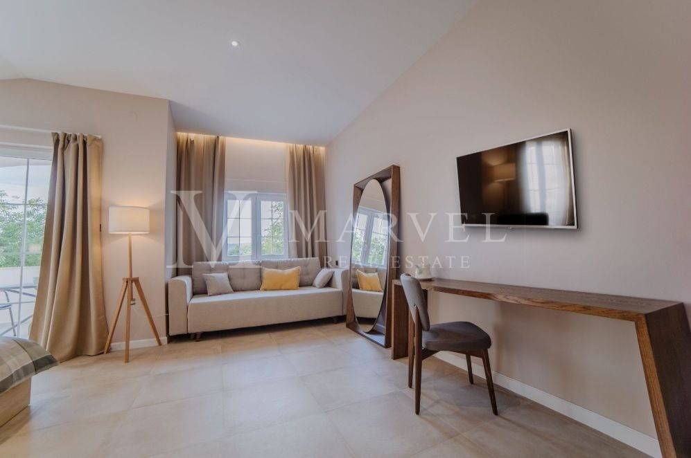 External stairs lead to the first floor, which has two separate entrances, each including a room with a private bathroom and a balcony with a partial sea view. There is also a basement of 4 x 4.50 m. The property is beautifully decorated and is being sold fully furnished.