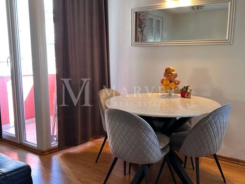 The apartment includes two spacious bedrooms, two bathrooms, a bright living room with a dining area, and a modern kitchen. From the living room, theres access to a covered loggia with a sea view, perfect for morning coffee or evening relaxation.