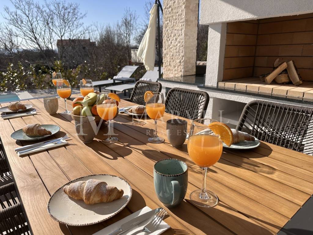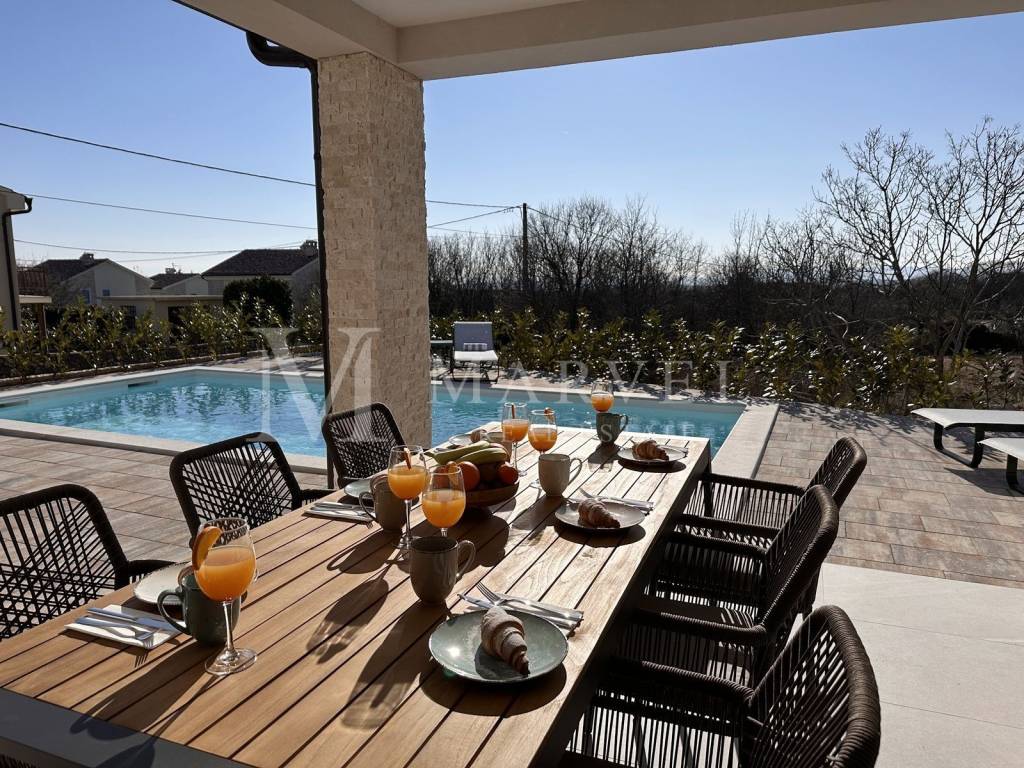 For sale: a modern villa with a pool, located in the peaceful village of Kras, in the municipality of Dobrinj, on the island of Krk. The property offers 178 m of living space on a total land area of 489 m.