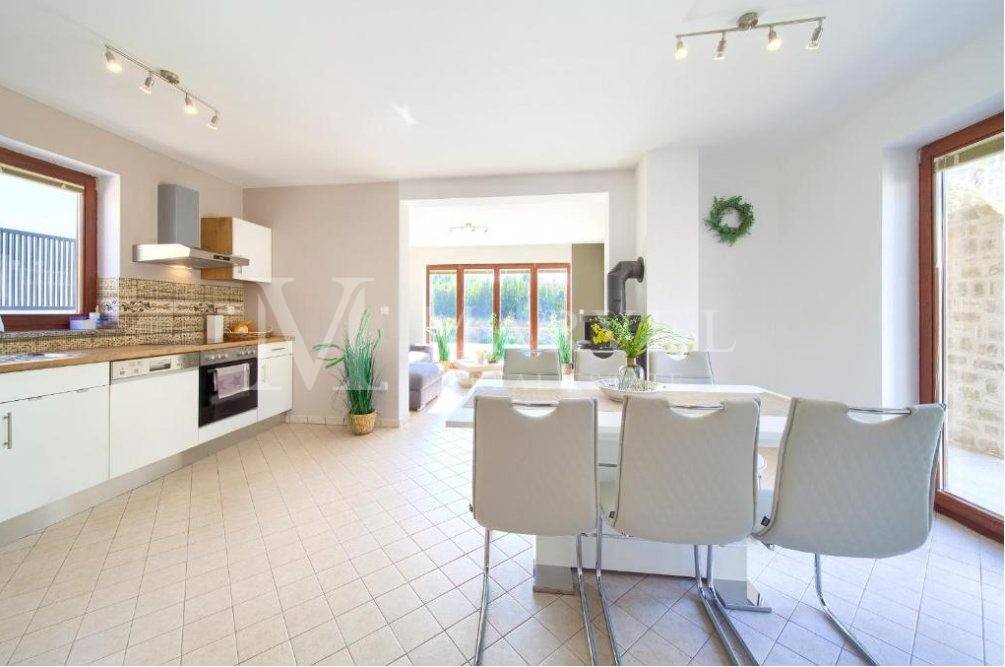 The house consists of ground floor and first floor. On the ground floor, there is a bathroom, bedroom, storage, kitchen with a dining room, and a living room with a fireplace. From the ground floor, there is access to a paved yard and covered terraces, ideal for outdoor relaxation. A stone barbecue in the yard allows for enjoyable summer evenings with family and friends. The plot provides three parking spaces.