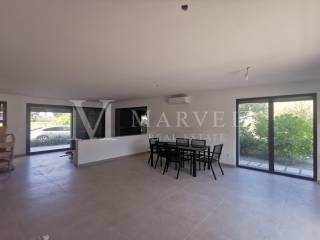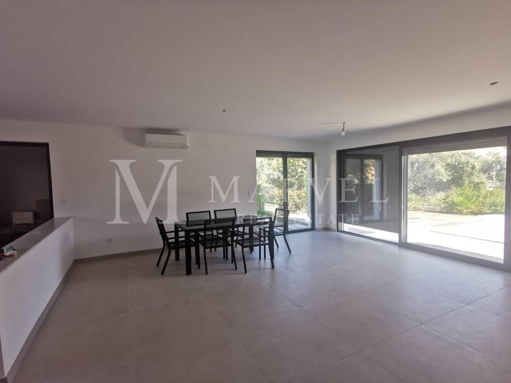 Kitchen with dining area and living room with access to a spacious terrace and a private garden of 134 m with a swimming pool.