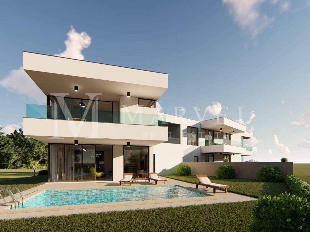 The ground floor includes an entrance area, wine cellar, bathroom, and an open space living room with a dining area and kitchen, leading out to a terrace and a landscaped garden with a 22.75 m pool.
