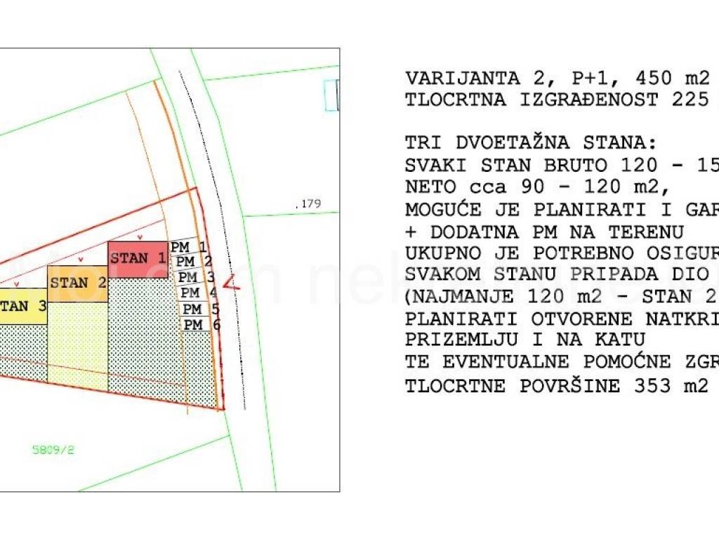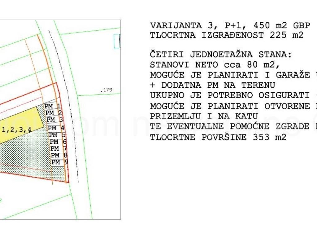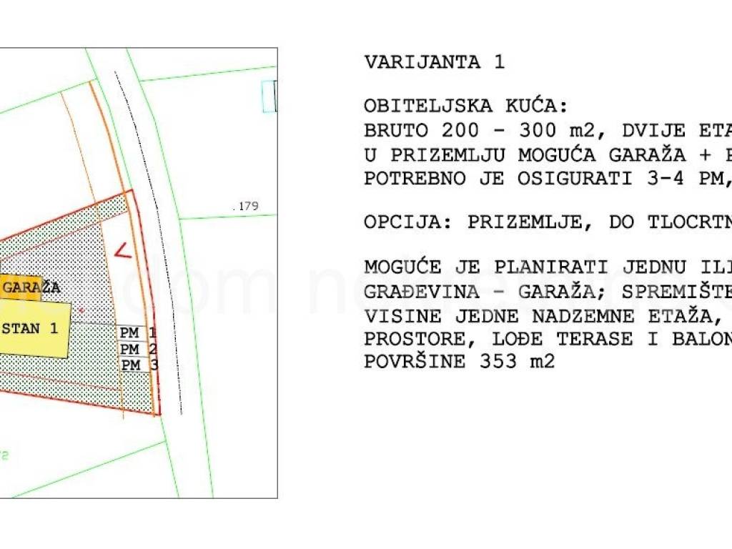 Među fotografijama u oglasu su neke od mogućih varijanti gradnje prema novom GUP-u (napomena: na čestici je moguće planirati i veću gradnju od prikazanih, uz poštivanje udaljenosti od međa h/2 i katnosti do - podrum, prizemlje, 2 kata i uvučeni kat ili potkrovlje).