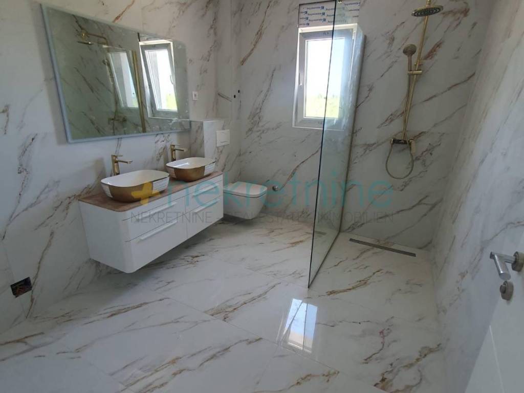 Kupaonica s modernim pločicama, duplim umivaonicima, visećim WC-ima, walk-in tušem i LED rasvjetom.