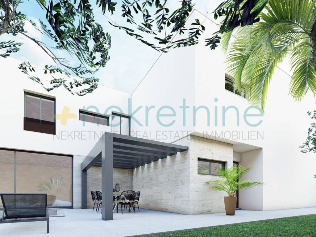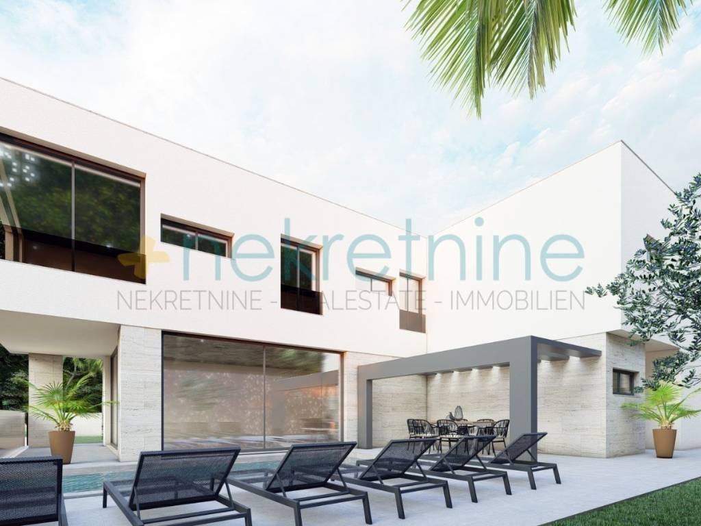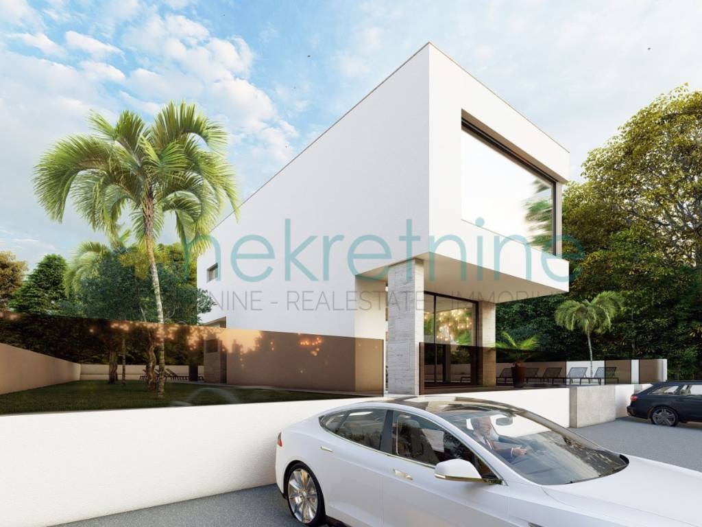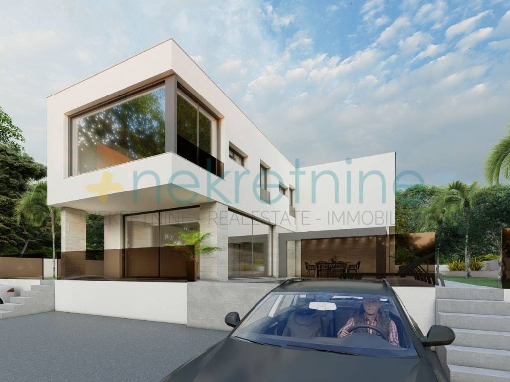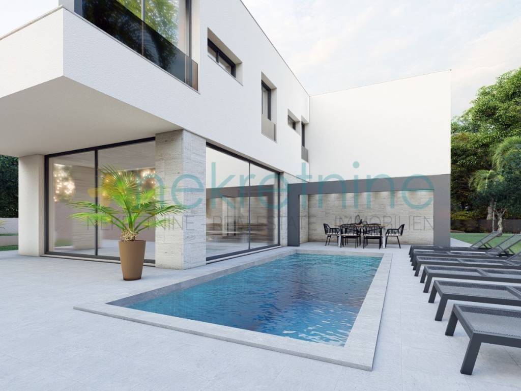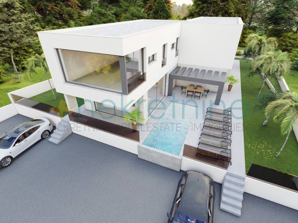Villa je dizajnirana s modernim arhitektonskim elementima, kombinirajući čiste linije, neutralne tonove i vrhunske kvalitetne materijale.