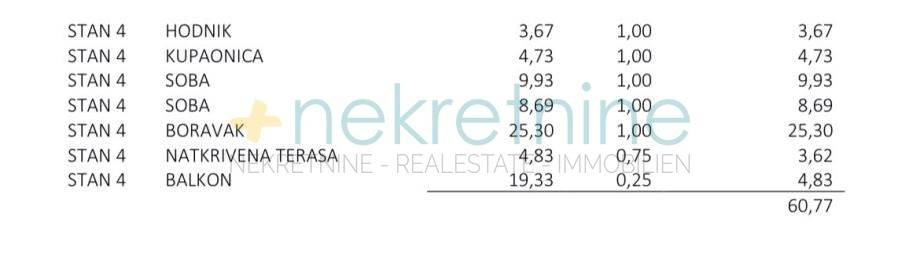 Apartman se nalazi na 1. katu, a sastoji se od dnevnog boravka s kuhinjom i blagovaonicom, dvije spavaće sobe, kupaonice, hodnika, natkrivene terase i velikog balkona. Ukupna površina stana je 71,48 m, a uključeno je i parkirno mjesto.