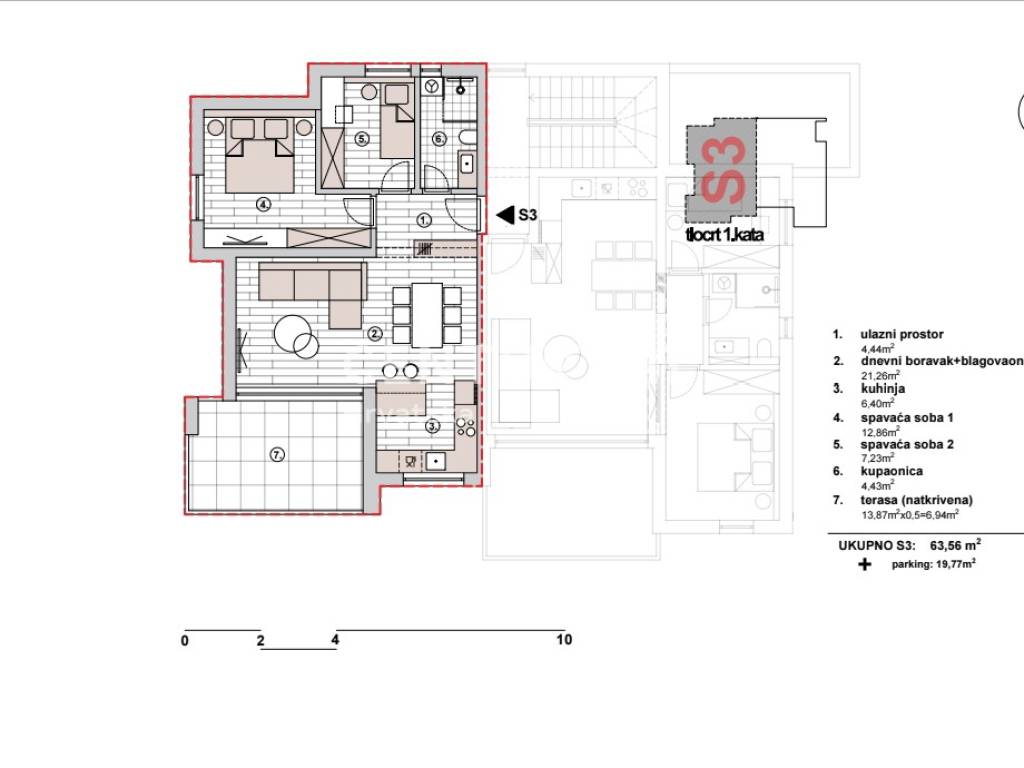 Na prodaju je moderan 2,5-sobni stan površine 73,45 m2, smješten na prvom katu novogradnje s ukupno četiri kata u Primoštenu. Ovaj stan se ističe svojom suvremenom arhitekturom i privlačnom lokacijom u blizini prirode.