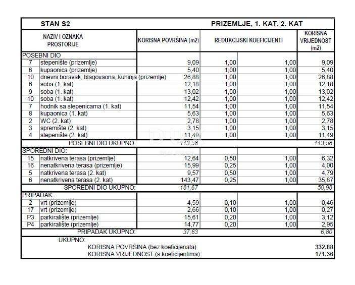 ŠIBENIK, VODICE – Exclusive three-storey apartment near the beach with spectacular sea views   DUX presents a luxurious three-storey apartment S2, located in an extremely attractive location in Vodice, just 200 meters from the sea and well-maintained beaches, or a four-minute easy walk. Thanks to its superb orientation and position, the apartment offers a spectacular panoramic view of the sea, maximum comfort and the definition of modern Mediterranean life.   The apartment is spread over three floors – ground floor, first floor and roof terrace – with a total net usable area of 171.36 m², while the total area with associated amenities is an impressive 332.88 m².   The ground floor features an open-concept kitchen, dining room and living room with access to the terrace, a bathroom and a storage room.  The first floor is reached by an internal staircase, where there are three spacious bedrooms and a bathroom.  The second floor is reached by stairs and features a bathroom, storage room and access to a large 153 m² roof terrace, ideal for luxurious relaxation and enjoyment. This spacious terrace offers a multitude of possibilities – a jacuzzi, a sundeck, a lounge area and an outdoor dining area, with a perfect and breathtaking view of the sea and the surrounding area.   Floor plan:  Ground floor:  Open concept living room, kitchen and dining room: 26.88 m²  Bathroom: 5.40 m²  Staircase: 9.09 m²  Covered terrace: 12.64 m²  Uncovered terrace: 15.99 m²   1st floor:  Bedroom 1: 12.18 m²  Bedroom 2: 13.02 m²  Bedroom 3: 12.42 m²  Hallway with staircase: 11.54 m²  Bathroom: 5.63 m²   2nd floor – Roof terrace:  WC: 2.78 m²  Storage room: 3.15 m²  Staircase: 11.49 m²  Covered terrace: 9.57 m²  Uncovered terrace: 143.47 m²   The spacious roof terrace of almost 150 m² offers an exceptionally luxurious space for relaxation, sunbathing and socializing, with an incredible panoramic view of the sea and the surrounding area – a real rarity on the market and a symbol of exclusive Mediterranean life.   The apartment comes with two parking spaces, which further increases the practicality and value of this property.   Equipment and features:  Distance from the sea and beach: 200 m / 4 minutes walk  Spectacular sea view  Underfloor heating in all rooms  Air conditioning in each room  PVC joinery with triple glazing and electric shutters  Quality thermal insulation of the facade (10 cm)  High-quality materials and finishing  Sanitary and ceramics from renowned manufacturers  Reputed and proven contractor  150 m² roof terrace - the true definition of luxury   This modern new building in Vodice is the perfect choice for those looking for a spacious, luxurious home near the sea or want a safe and prestigious investment on the Adriatic coast.   For all additional information and viewing of this exclusive property, please feel free to contact us.   Vodice is one of the most desirable places to live and vacation on the Šibenik Riviera. Known for their long promenades by the sea, well-kept beaches and a rich tourist offer, they offer a perfect combination of Mediterranean charm and modern life. The Krka and Kornati national parks are in the immediate vicinity, while Split and Zadar airports are 50 and 85 kilometers away, respectively.  Dear clients, the agency commission is charged in accordance with the General Terms and Conditions: www.dux-nekretnine.hr/opci-uvjeti-poslovanja  ID CODE: 43024  Dux Zadar Mob: +385 91 312 1121 Tel: +385 91 480 8808 E-mail: info@dux-nekretnine.hr www.dux-dalmacija.com