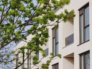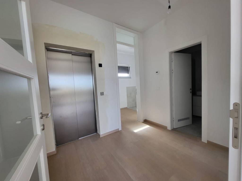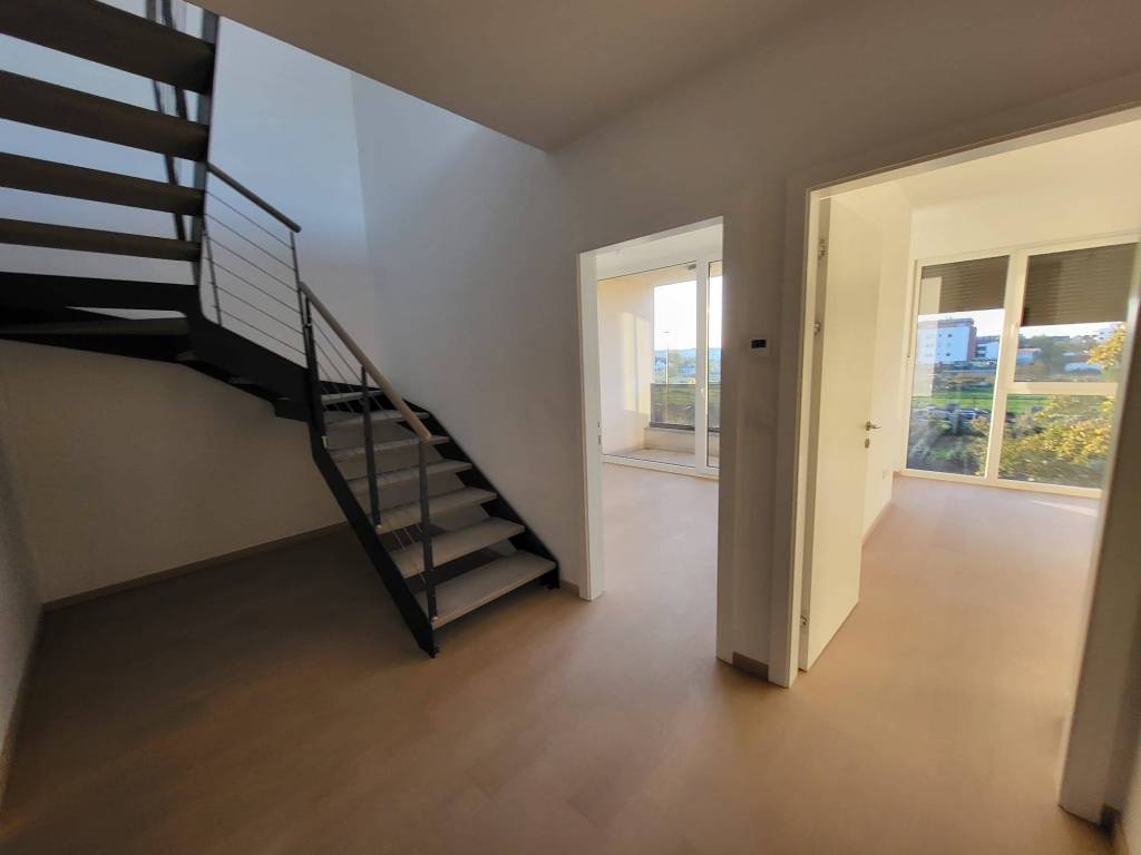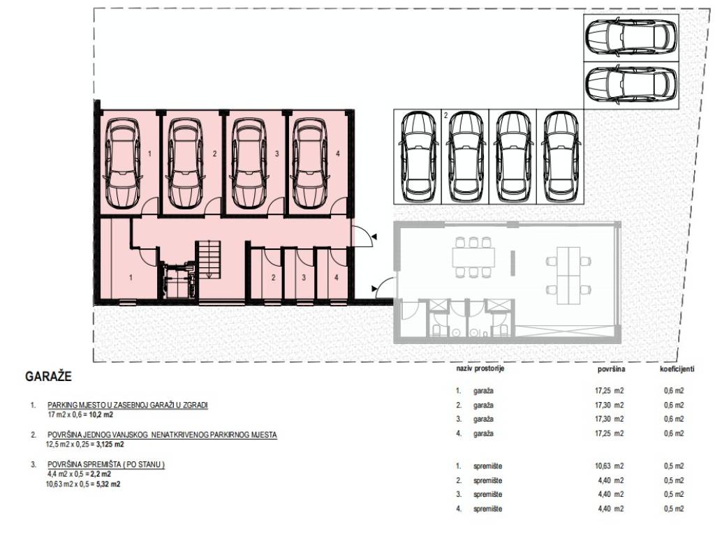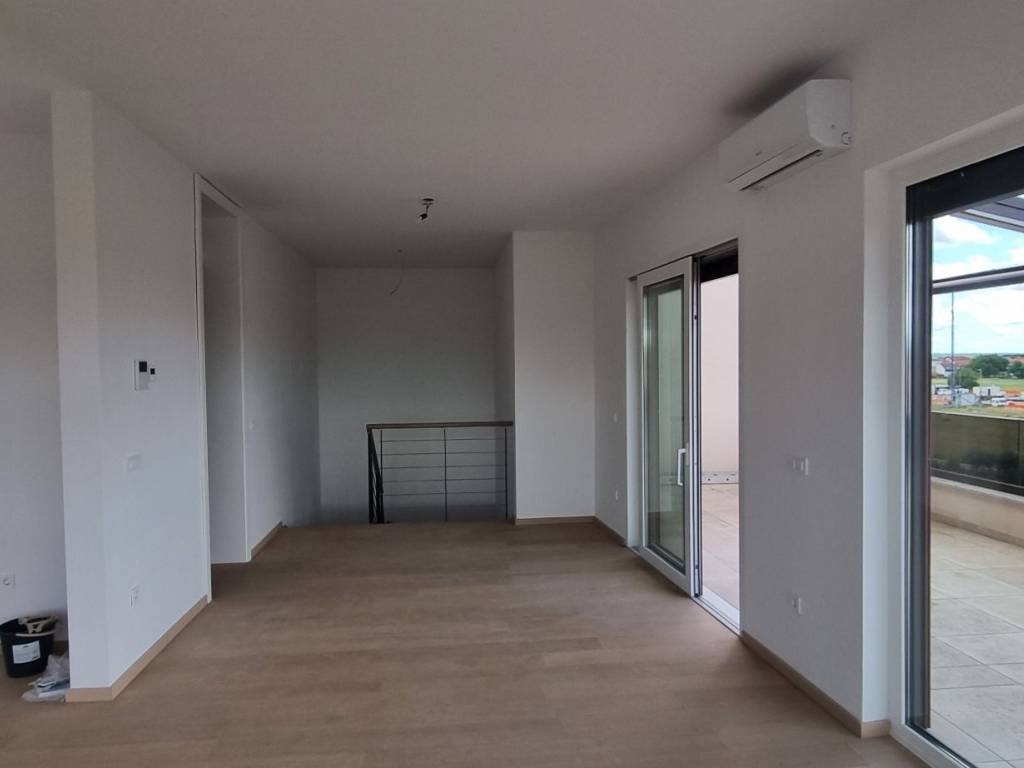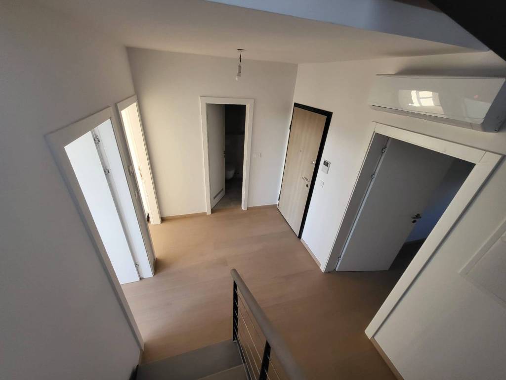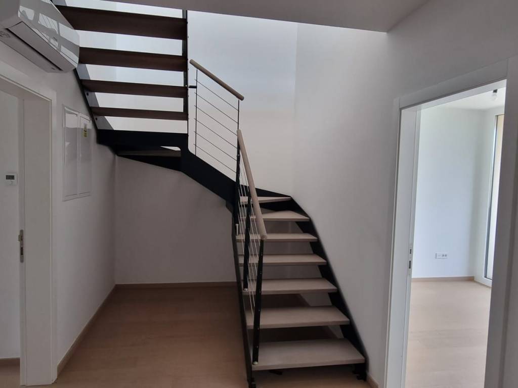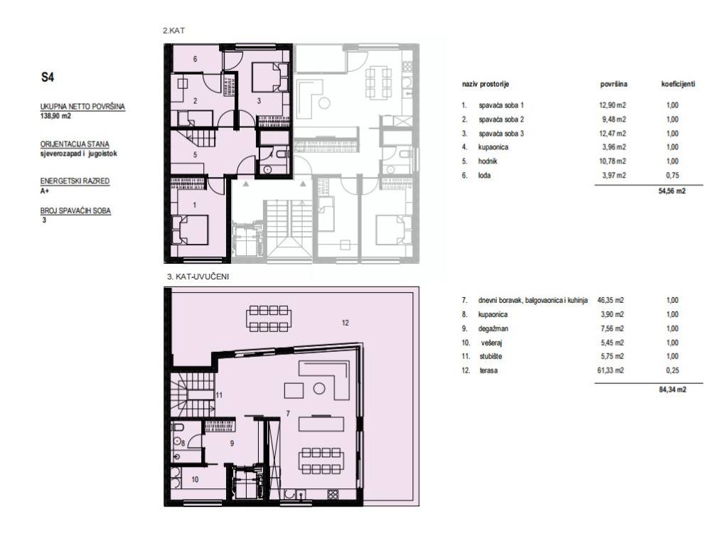 2.etaža (uvučeni kat) – prostrani dnevni boravak s blagovaonicom i kuhinjom, velikim staklenim površinama i izlaskom na prostranu terasu, degažman, vešeraj i stubište. Stan ima i pripadajuće spremište u prizemlju zgrade.