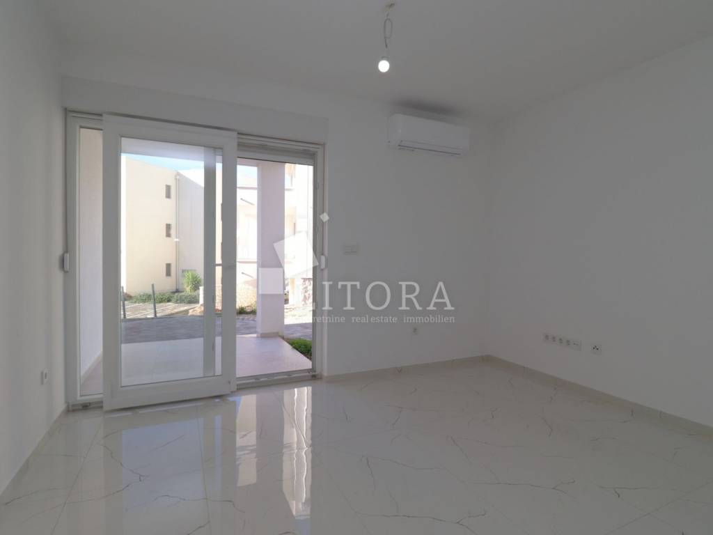 Žaborić – 200 m from the pebble beach. Newly built – move-in ready one-bedroom apartment with a small garden. Located in a highly attractive area of Žaborić, just 200 meters from the well-maintained beach and 300 meters from the town center, this modern one-bedroom apartment is situated on the ground floor of a high-quality new building. The total usable area of the apartment is 44.34 m². It is east–west oriented and located on the ground floor of a multi-apartment building. The apartment consists of a kitchen, dining area, and living room with access to a covered terrace of 5.82 m², next to a small flower garden of 4.93 m². Additionally, there is a hallway, bathroom, and a bedroom with access to a paved courtyard/terrace of 24.62 m² – a perfect spot for relaxation. The apartment is fully completed, move-in ready, and equipped with high-quality materials and finishes: modern ceramics, underfloor heating with a heat pump throughout the apartment, elegant sanitary ware, PVC windows with shutters, security entrance door, and air-conditioning units in both the living room and the bedroom. The apartment comes with one parking space.
